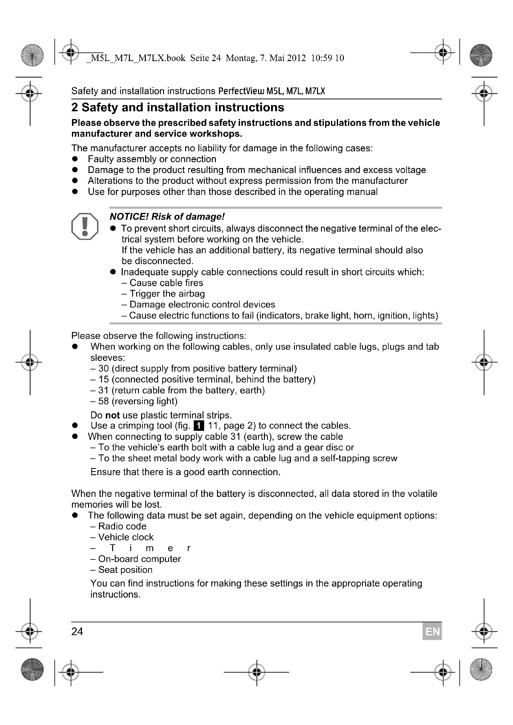 NOTICE! Risk of damage! To prevent short circuits, always disconnect the negative terminal of the elec- trical system before working on the vehicle. If the vehicle has an additional battery, its negative terminal should also be disconnected. Inadequate supply cable connections could result in short circuits which: – Cause cable fires – Trigger the airbag – Damage electronic control devices – Cause electric functions to fail (indicators, brake light, horn, ignition, lights) Please observe the following instructions: When working on the following cables, only use insulated cable lugs, plugs and tab sleeves: – 30 (direct supply from positive battery terminal) – 15 (connected positive terminal, behind the battery) – 31 (return cable from the battery, earth) – 58 (reversing light) Do not use plastic terminal strips. Use a crimping tool (fig. 1 11, page 2) to connect the cables. When connecting to supply cable 31 (earth), screw the cable – To the vehicle’s earth bolt with a cable lug and a gear disc or – To the sheet metal body work with a cable lug and a self-tapping screw Ensure that there is a good earth connection. When the negative terminal of the battery is disconnected, all data stored in the volatile memories will be lost. The following data must be set again, depending on the vehicle equipment options: – Radio code – Vehicle clock –Timer – On-board computer – Seat position You can find instructions for making these settings in the appropriate operating instructions. _M5L_M7L_M7LX.book Seite 24 Montag, 7. Mai 2012 10:59 10PerfectView M5L, M7L, M7LX Safety and installation instructions