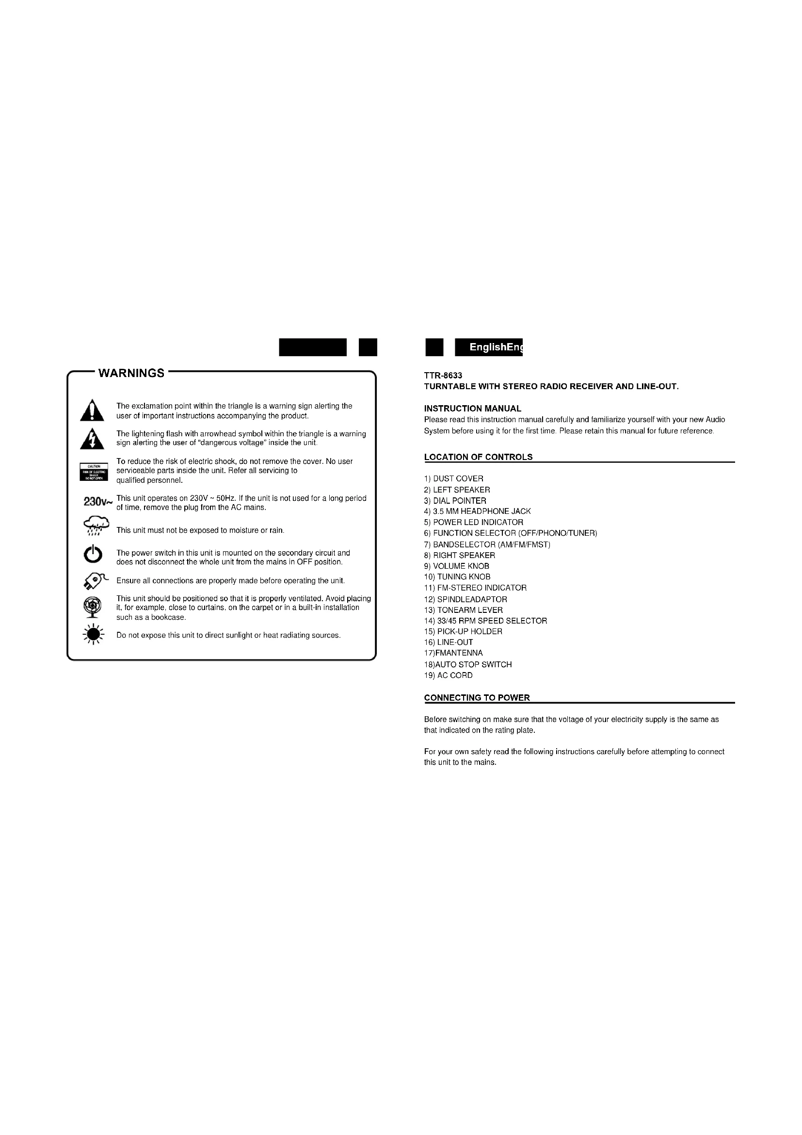 - Seu novo aparelho foi construido e montado sob o estrito controle de qualidade da ROADSTAR. Agradecemos por ter comprado nosso produto para a sua diversão. Antes de usar esta unidade é necessário ler com atençâo este manual de instruções pare que possa ser usada apropriadamente; mantenha o manual ao seu alcance para outras informações.EnglishEnglish 1 2 WARNINGS The exclamation point within the triangle is a warning sign alerting the user of important instructions accompanying the product. The lightening flash with arrowhead symbol within the triangle is a warning sign alerting the user of “dangerous voltage” inside the unit. To reduce the risk of electric shock, do not remove the cover. No user serviceable parts inside the unit. Refer all servicing to qualified personnel. This unit operates on 230V ~ 50Hz. If the unit is not used for a long period of time, remove the plug from the AC mains. This unit must not be exposed to moisture or rain. The power switch in this unit is mounted on the secondary circuit and does not disconnect the whole unit from the mains in OFF position. Ensure all connections are properly made before operating the unit. This unit should be positioned so that it is properly ventilated. Avoid placing it, for example, close to curtains, on the carpet or in a built-in installation such as a bookcase. Do not expose this unit to direct sunlight or heat radiating sources. TTR-8633 TURNTABLE WITH STEREO RADIO RECEIVER AND LINE-OUT. INSTRUCTION MANUAL Please read this instruction manual carefully and familiarize yourself with your new Audio System before using it for the first time. Please retain this manual for future reference.