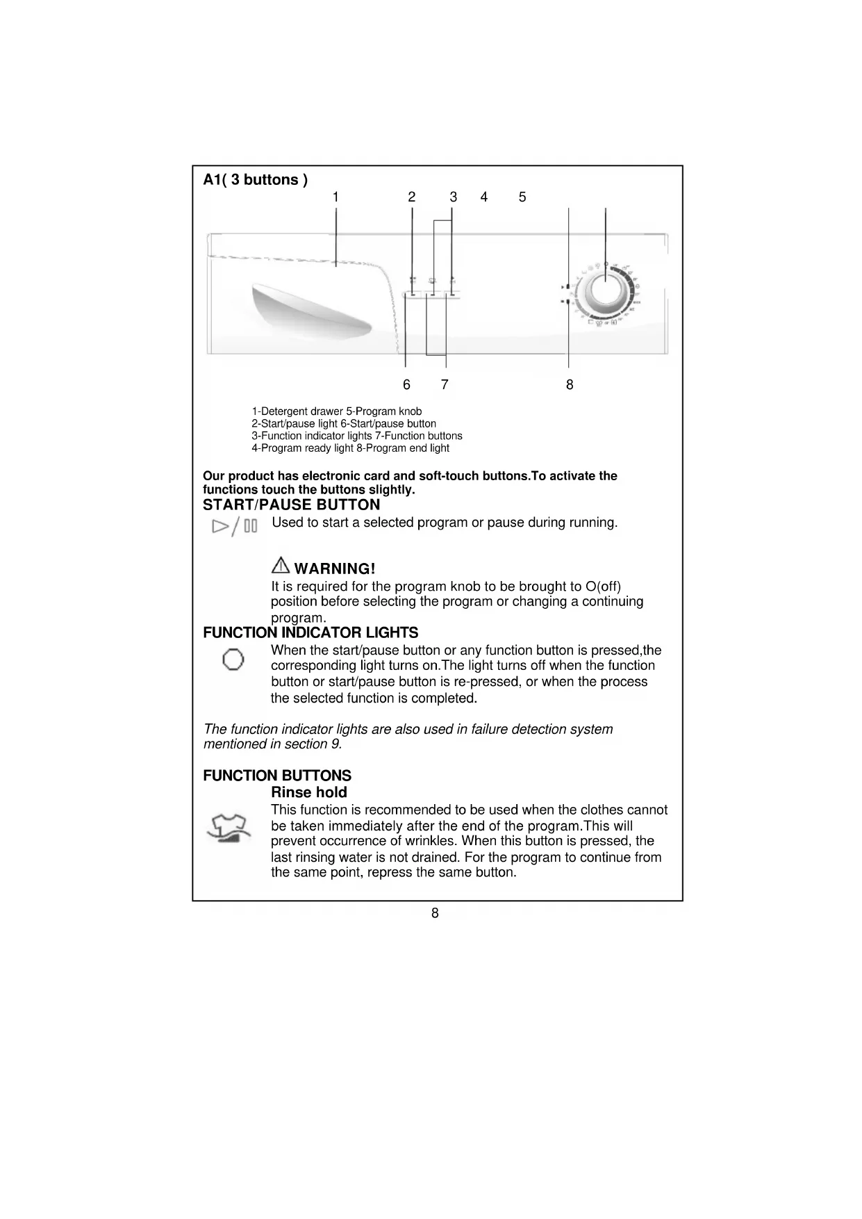 When the start/pause button or any function button is pressed,the corresponding light turns on.The light turns off when the function button or start/pause button is re-pressed, or when the process the selected function is completed. The function indicator lights are also used in failure detection system mentioned in section 9. FUNCTION BUTTONS Rinse hold This function is recommended to be used when the clothes cannot be taken immediately after the end of the program.This will prevent occurrence of wrinkles. When this button is pressed, the last rinsing water is not drained. For the program to continue from the same point, repress the same button. 8If you do not want your sensitive clothes to be spinned or you want them to be spinned sensitively, turn the program knob to O (off) position. Bring the program knob on one of the draining or spinning programs you desire and press the start/pause button. If the program you have selected is a drain program, your machine will draining the water inside.If you have selected a spinning program, your machine will perform a spinning operation and then end the program. Extra rinse You can have one more rinsing done in addition to the rinses which your machine has made in all washing programs by using this function. No spin This program is recommended to be used for your sensitive clothes on which no spinning should be done. By pressing this function button, you can cancel the spinning process which is included in the program. Soak Using this function will ensure better cleaning by leaving your clothes in water with detergent for a certain period of time before your machine takes in the initial water and starts washing. This function is recommended to be used for very dirty clothes. Easy ironing By using this function, you can ensure your clothes to come out less wrinkled after the washing. Plus water By using this function, you can enable your machine to take in some more water than the amount in the normal washing operation. This will decrease the friction that occurs between your clothes.This function is recommended to be used for your sensitive clothes or for the ones you desire to be rinsed really well. Spin speed reduce By using this function, you can reduce your spinning cycle speed from 1200 cycles to 800 cycles, from 1000 cycles to 600 cycles, or from 800 cycles to 500 cycles depending on the model you’ve chosen. 9WARNING! Functions vary depending on the model you have chosen.If you forgot to use additional function and your machine starts to wash push the additional function button if the indicator light is on. Additional function will be activated.If the indicator light is not on,additional function will not be activated. SPIN SPEED SELECTOR (Valid for A3 models) By the spin speed selector knob, you can make the adjustment of speed for the process of spinning your clothes.The speed adjustment interval is between O (No spin) and the maximum spinning speed of your machine. NOTE: Do the spinning process of your sensitive and delicate clothes in the most appropriate mode. PROGRAM KNOB With the program knob, you can select the program with which you desire to wash your clothes. You can adjust the program selection process by turning the program knob in both directions. You must be careful that the adjustment sign of the program knob is exactly on the program you want to select. When you bring the program knob to O(off) position, while your machine is running, your program will remain incomplete.