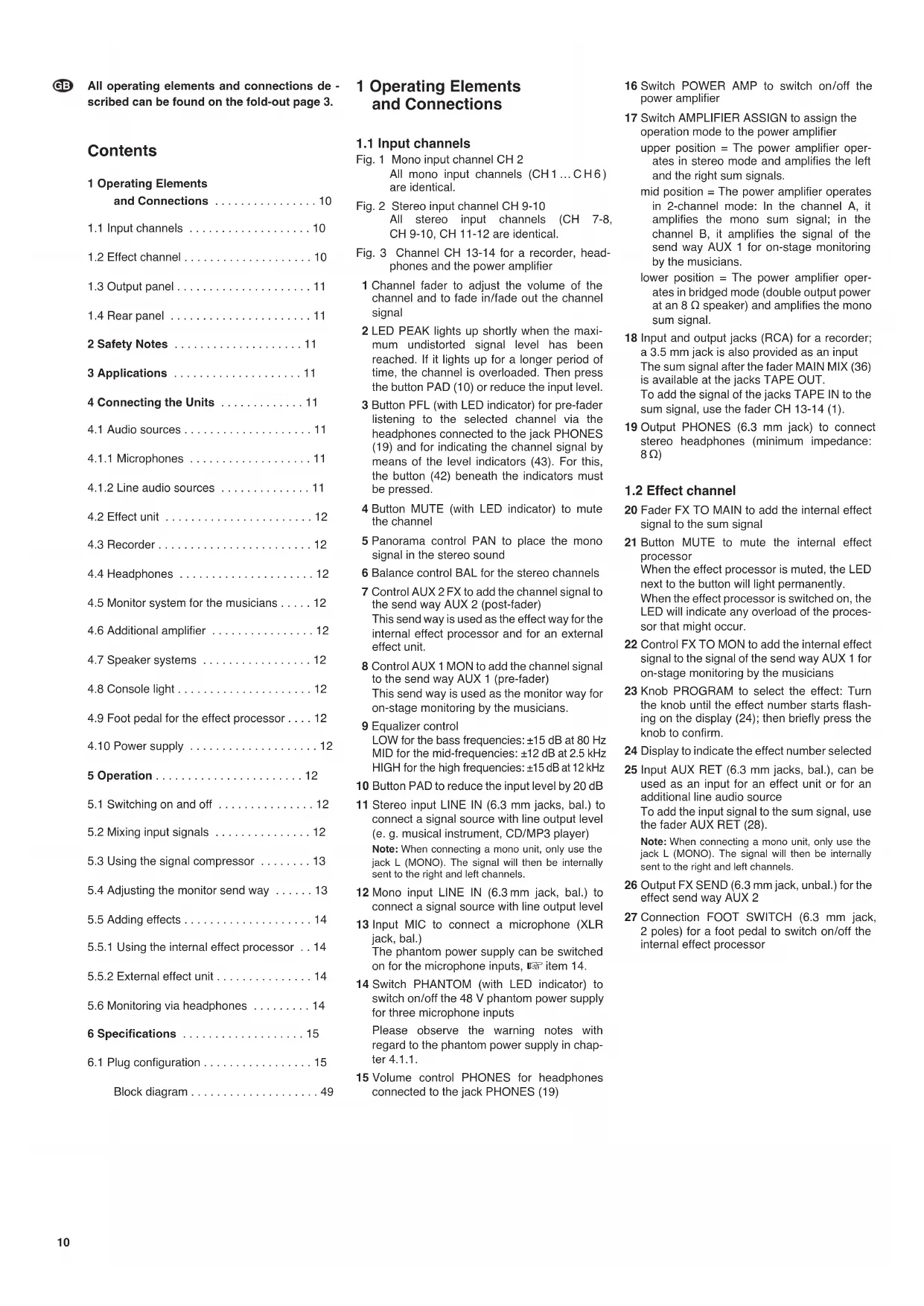 2 LED PEAK lights up shortly when the maximum undistorted signal level has been reached. If it lights up for a longer period of time, the channel is overloaded. Then press the button PAD (10) or reduce the input level.