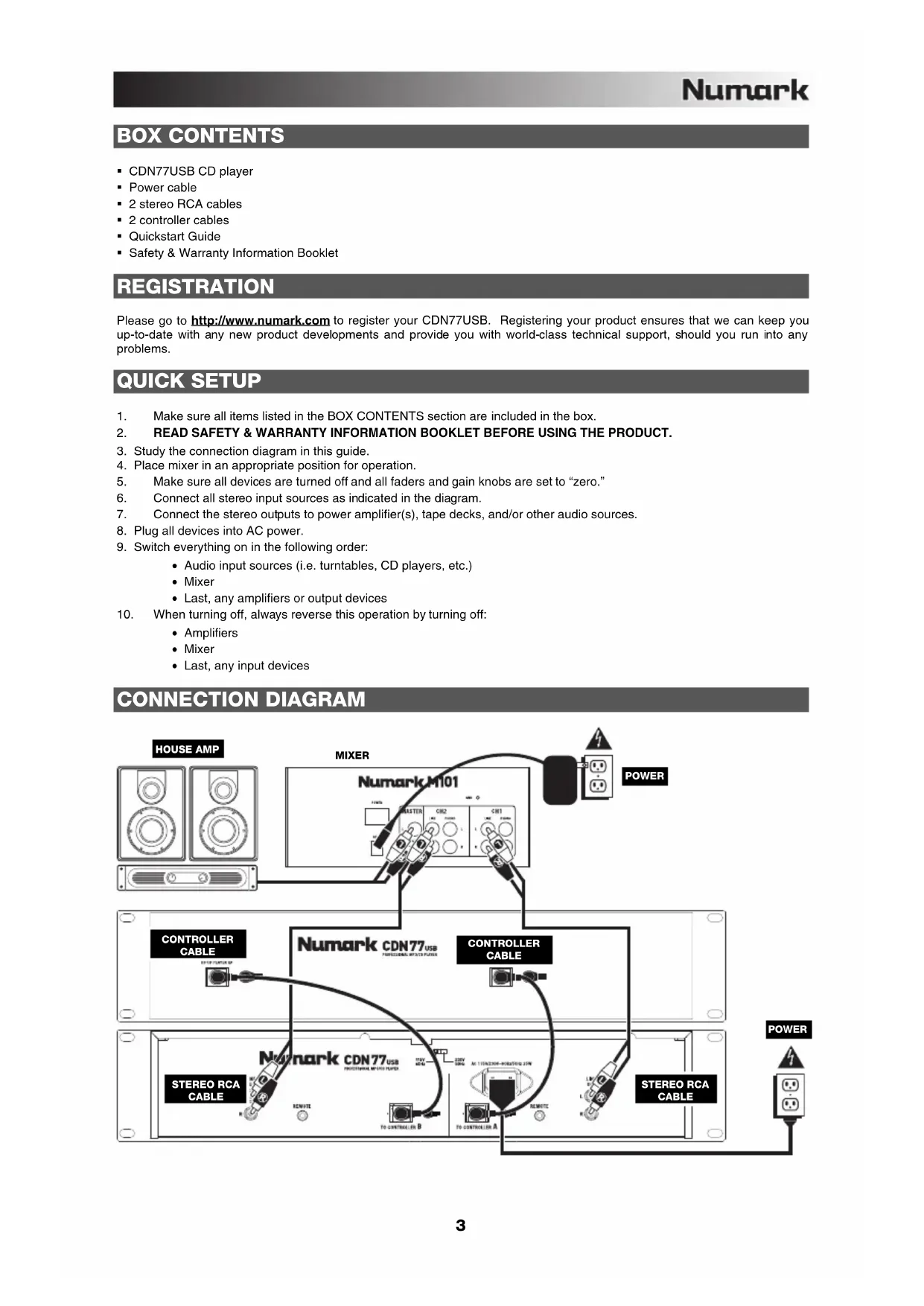 FRANÇAIS ( 11 – 14 ) GUIDA RAPIDA ITALIANO ( 15 – 18 ) KURZANLEITUNG DEUTSCH ( 19 – 22 )3 BOX CONTENTS CDN77USB CD player Power cable 2 stereo RCA cables 2 controller cables Quickstart Guide Safety & Warranty Information Booklet REGISTRATION Please go to http://www.numark.com to register your CDN77USB. Registering your product ensures that we can keep you up-to-date with any new product developments and provide you with world-class technical support, should you run into any problems. QUICK SETUP