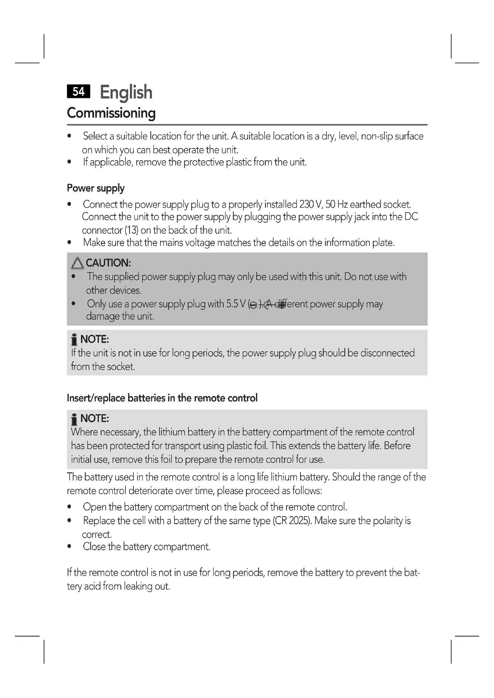 The power supply must only be used in dry areas. - Connect the power supply to a properly installed plug outlet. Check that the output voltage and the polarity of the power supply match the details on the connected unit!