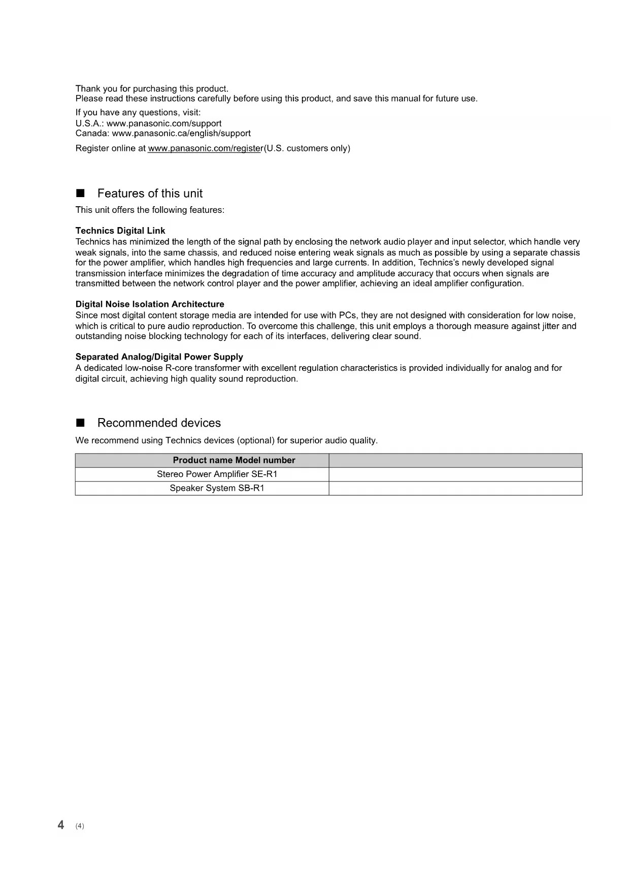 Owner’s Manual Manuel d’utilisation Network Audio Control Player Lecteur réseau audio avec commande SU-R1 SU-R1-SQT0504_PP_mst.book 1 ページ 2014年12月25日 木曜日 午後5時1分SU-R1-SQT0504_PP_mst.book 2 ページ 2014年12月25日 木曜日 午後5時1分Music is borderless and timeless, touching people’s hearts across cultures and generations. Each day the discovery of a truly emotive experience from an unencountered sound awaits. Let us take you on your journey to rediscover music. Sans frontières, la musique est aussi intemporelle, touchant le coeur des gens en traversant les cultures et les générations. Tous les jours, nous attendons la révélation d'une expérience émotionnelle authentique à partir d'un son venu de nulle part. Permettez-nous de vous emmener en voyage pour redécouvrir la musique. SU-R1-SQT0504_PP_mst.book 3 ページ 2014年12月25日 木曜日 午後5時1分4 Thank you for purchasing this product. Please read these instructions carefully before using this product, and save this manual for future use. If you have any questions, visit: U.S.A.: www.panasonic.com/support Canada: www.panasonic.ca/english/support Register online at www.panasonic.com/register (U.S. customers only) ∫ Features of this unit This unit offers the following features: Technics Digital Link Technics has minimized the length of the signal path by enclosing the network audio player and input selector, which handle very weak signals, into the same chassis, and reduced noise entering weak signals as much as possible by using a separate chassis for the power amplifier, which handles high frequencies and large currents. In addition, Technics’s newly developed signal transmission interface minimizes the degradation of time accuracy and amplitude accuracy that occurs when signals are transmitted between the network control player and the power amplifier, achieving an ideal amplifier configuration. Digital Noise Isolation Architecture Since most digital content storage media are intended for use with PCs, they are not designed with consideration for low noise, which is critical to pure audio reproduction. To overcome this challenge, this unit employs a thorough measure against jitter and outstanding noise blocking technology for each of its interfaces, delivering clear sound. Separated Analog/Digital Power Supply A dedicated low-noise R-core transformer with excellent regulation characteristics is provided individually for analog and for digital circuit, achieving high quality sound reproduction. ∫ Recommended devices We recommend using Technics devices (optional) for superior audio quality. Product name Model number Stereo Power Amplifier SE-R1 Speaker System SB-R1 (4) SU-R1-SQT0504_PP_mst.book 4 ページ 2014年12月25日 木曜日 午後5時1分5 English