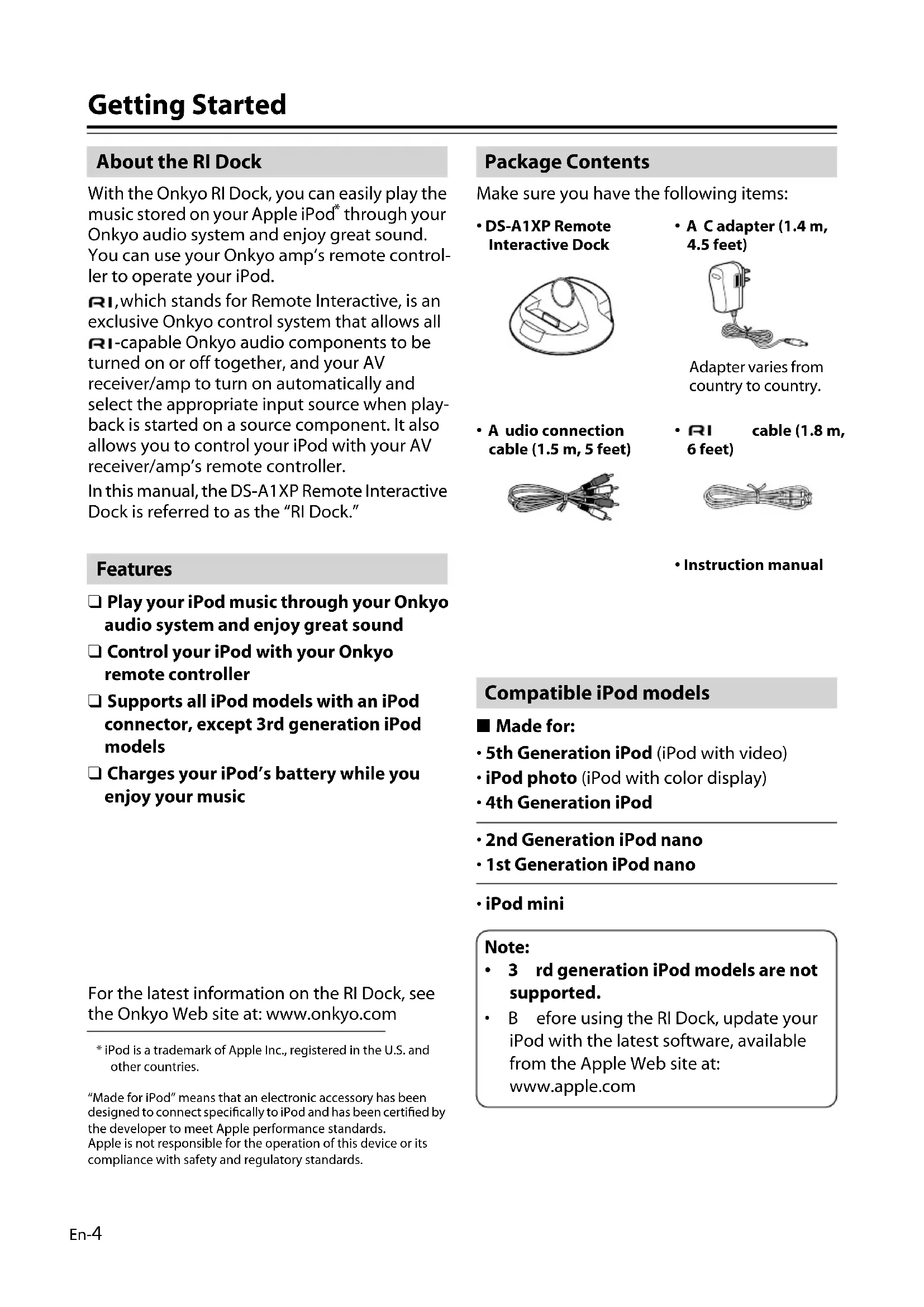 through your Onkyo audio system and enjoy great sound. You can use your Onkyo amp’s remote control- ler to operate your iPod. , which stands for Remote Interactive, is an exclusive Onkyo control system that allows all -capable Onkyo audio components to be turned on or off together, and your AV receiver/amp to turn on automatically and select the appropriate input source when play- back is started on a source component. It also allows you to control your iPod with your AV receiver/amp’s remote controller. In this manual, the DS-A1XP Remote Interactive Dock is referred to as the “RI Dock.” ❑ Play your iPod music through your Onkyo audio system and enjoy great sound ❑ Control your iPod with your Onkyo remote controller ❑ Supports all iPod models with an iPod connector, except 3rd generation iPod models ❑ Charges your iPod’s battery while you enjoy your music For the latest information on the RI Dock, see the Onkyo Web site at: www.onkyo.com