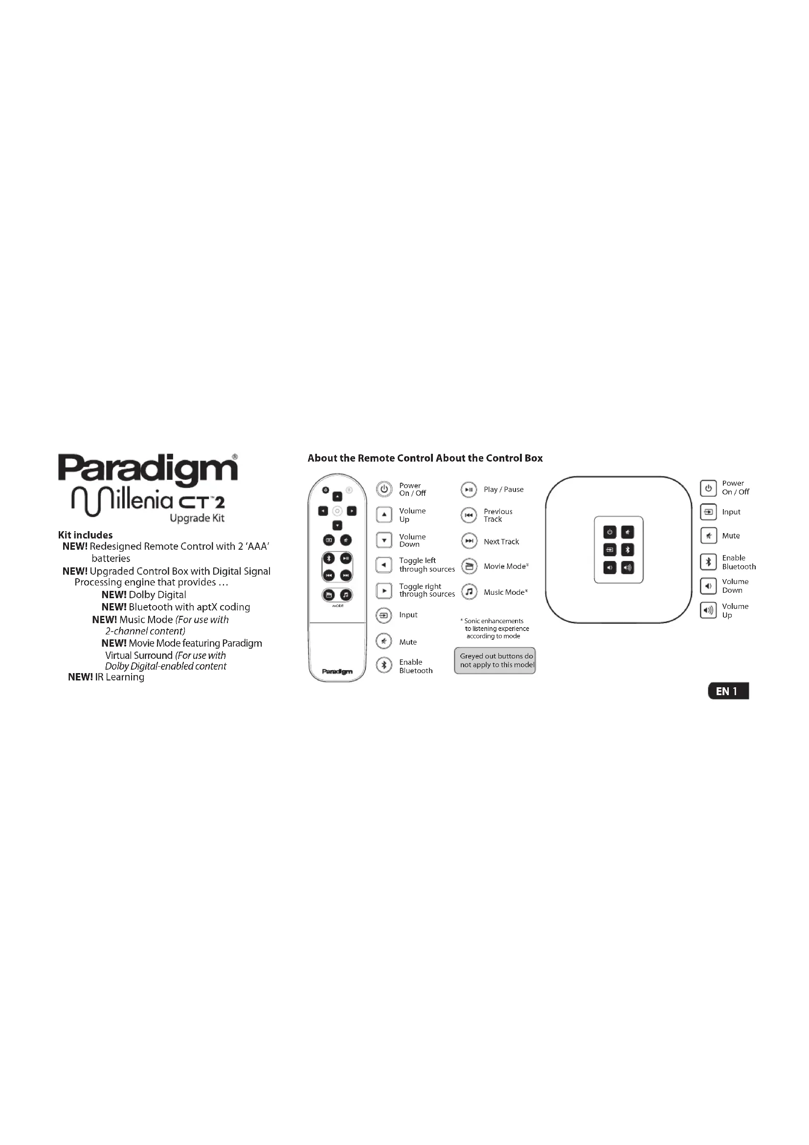 Kit includes NEW! Redesigned Remote Control with 2 ‘AAA’ batteries NEW! Upgraded Control Box with Digital Signal Processing engine that provides … NEW! Dolby Digital NEW! Bluetooth with aptX coding NEW! Music Mode (For use with 2-channel content) NEW! Movie Mode featuring Paradigm Virtual Surround (For use with Dolby Digital-enabled content NEW! IR Learning MODE Input Power On / Off Volume Down Volume