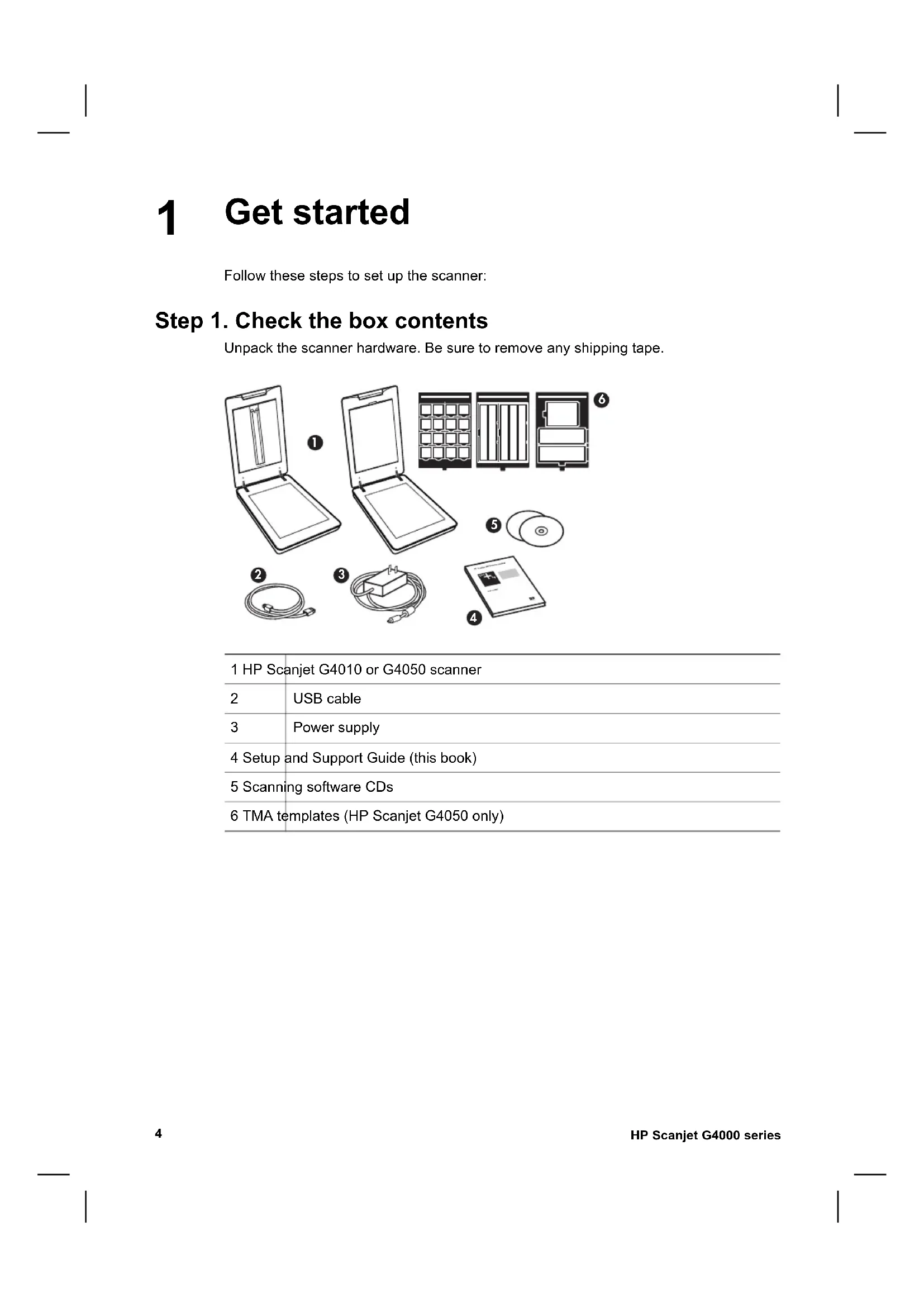 Power supply 4 Setup and Support Guide (this book) 5 Scanning software CDs 6 TMA templates (HP Scanjet G4050 only)