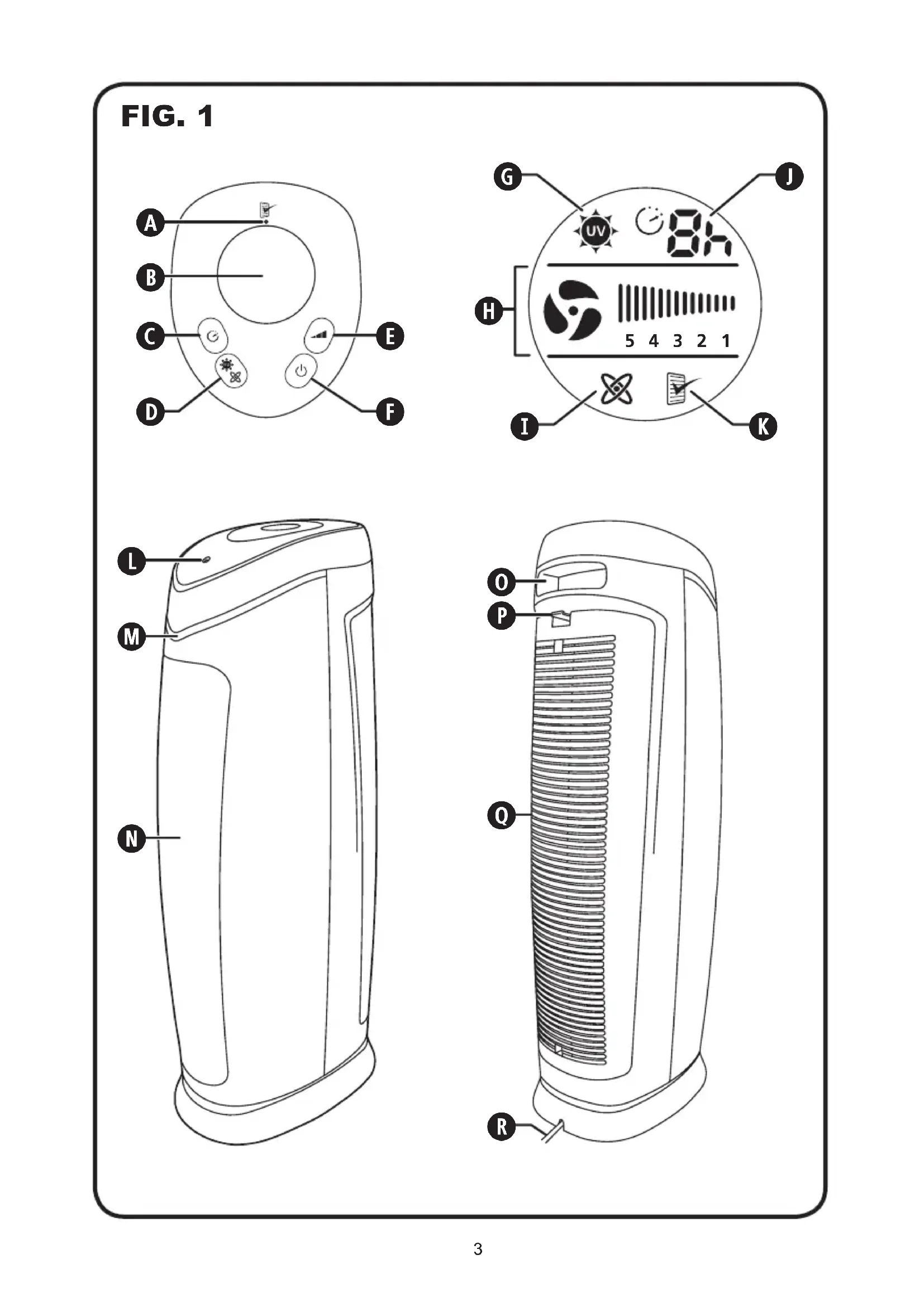 UV-C lamp. Do not stare at the lamp. To protect against electrical shock, do not immerse the fan, plug or cord in water or spray with liquids. Avoid contact with any moving parts. Do not operate in the presence of explosive and/or ammable fumes. Do not operate fan until fully assembled with all parts properly in place. To avoid re hazard, NEVER place the cord under rugs or any parts near an open ame, cooking or other heating appliance. Do not use outdoors. Do not let the cord hang over the edge of a table or counter, or come into contact with hot surfaces. Always use on a dry, level surface. Do not operate your fan unless the fan grilles are properly tted. This product is intended for household use ONLY and not for commercial or industrial applications. Should the fan stop working, rst check the fuse in the plug or fuse/circuit breaker at the distribution board is operating, before contacting the manufacturer or service agent. Disconnect the appliance from the mains supply before cleaning or maintenance. PARTS (FIG 1) A Filter reset button B LCD display C Timer select button D UV/Ioniser mode select button E Fan speed select button F On/off button G UV active icon H Fan speed display I Ioniser active icon J Timer active icon K Filter service indicator icon L On light M Illuminated strip N Air outlet grille O Carrying handle P Rear grille latch Q Rear grille R Power cord