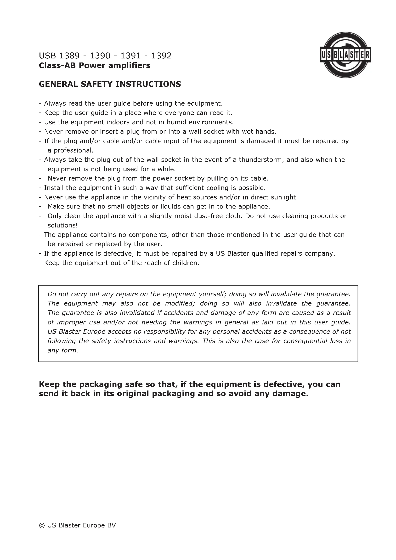 Do not carry out any repairs on the equipment yourself; doing so will invalidate the guarantee. The equipment may also not be modified; doing so will also invalidate the guarantee. The guarantee is also invalidated if accidents and damage of any form are caused as a result of improper use and/or not heeding the warnings in general as laid out in this user guide. US Blaster Europe accepts no responsibility for any personal accidents as a consequence of not following the safety instructions and warnings. This is also the case for consequential loss in any form.