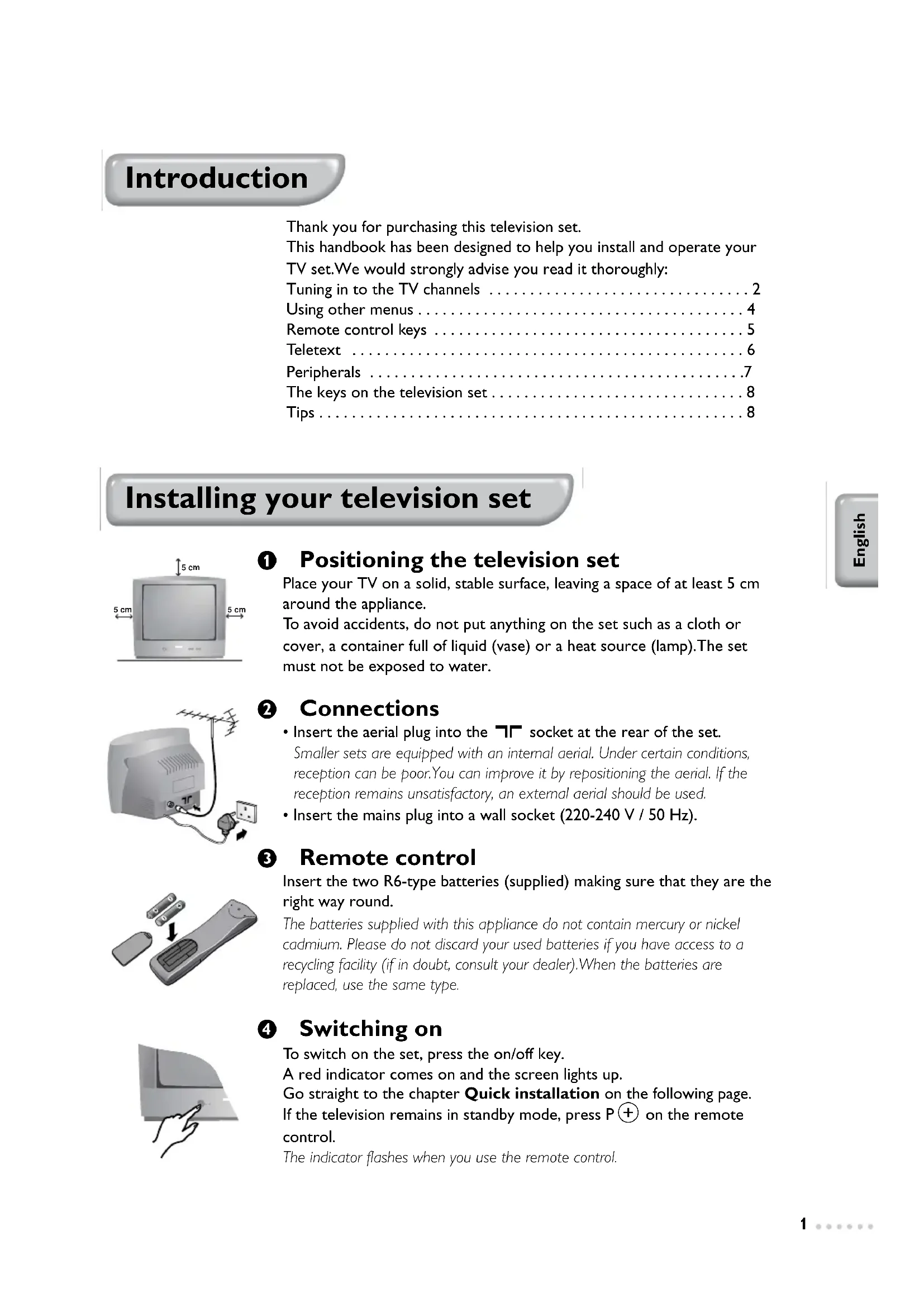 - Insert the mains plug into a wall socket (220-240 V / 50 Hz). ê Remote control Insert the two R6-type batteries (supplied) making sure that they are the right way round. The batteries supplied with this appliance do not contain mercury or nickel cadmium. Please do not discard your used batteries if you have access to a recycling facility (if in doubt, consult your dealer).When the batteries are replaced, use the same type. ® Switching on To switch on the set, press the on/off key. A red indicator comes on and the screen lights up. Go straight to the chapter Quick installation on the following page. If the television remains in standby mode, press P # on the remote control. The indicator flashes when you use the remote control.2 Tuning in to channels Quick installation (first use) The first time you switch on the television, a menu appears on the screen. This menu asks you to choose the language of the other menus. If the menu does not appear, hold down the PROGRAM- and PROGRAM+ keys (ora- and P-) on the set for 4 seconds to bring it up. æ Use the keys numbered from 0 to 9 on the remote control to choose your language (for English, press 1).Another menu appears. Â Select your country (for GB, press 9). ê As soon as your country is entered, tuning in starts automatically. The operation takes a few minutes.A display shows the search status and the number of programmes found.When it has finished, the menu disappears and the last programme is displayed. If no programmes are found, refer to the chapter entitled Tips on p. 8. ® If the transmitter or the cable network broadcasts the automatic sort signal, the programmes will be correctly numbered. † If not, the programmes found will be numbered in descending order starting at 99, 98, 97, etc. (or 79, 78, ...). Use the SORT menu to renumber them. Some transmitters or cable networks broadcast their own sort parameters (region, language, etc.).Where this is the case, make your choice using the IJkeys and confirm with L. æ Press the H key.The main menu is displayed. Â Press I once to select INSTALLATION, then press L. The INSTALLATION menu appears.The LANGUAGE option is activated. ê Press J 3 times to select SORT then press L. The SORT menu appears.The FROM option is activated. ® Select the programme you wish to renumber using keys KLor 0 to