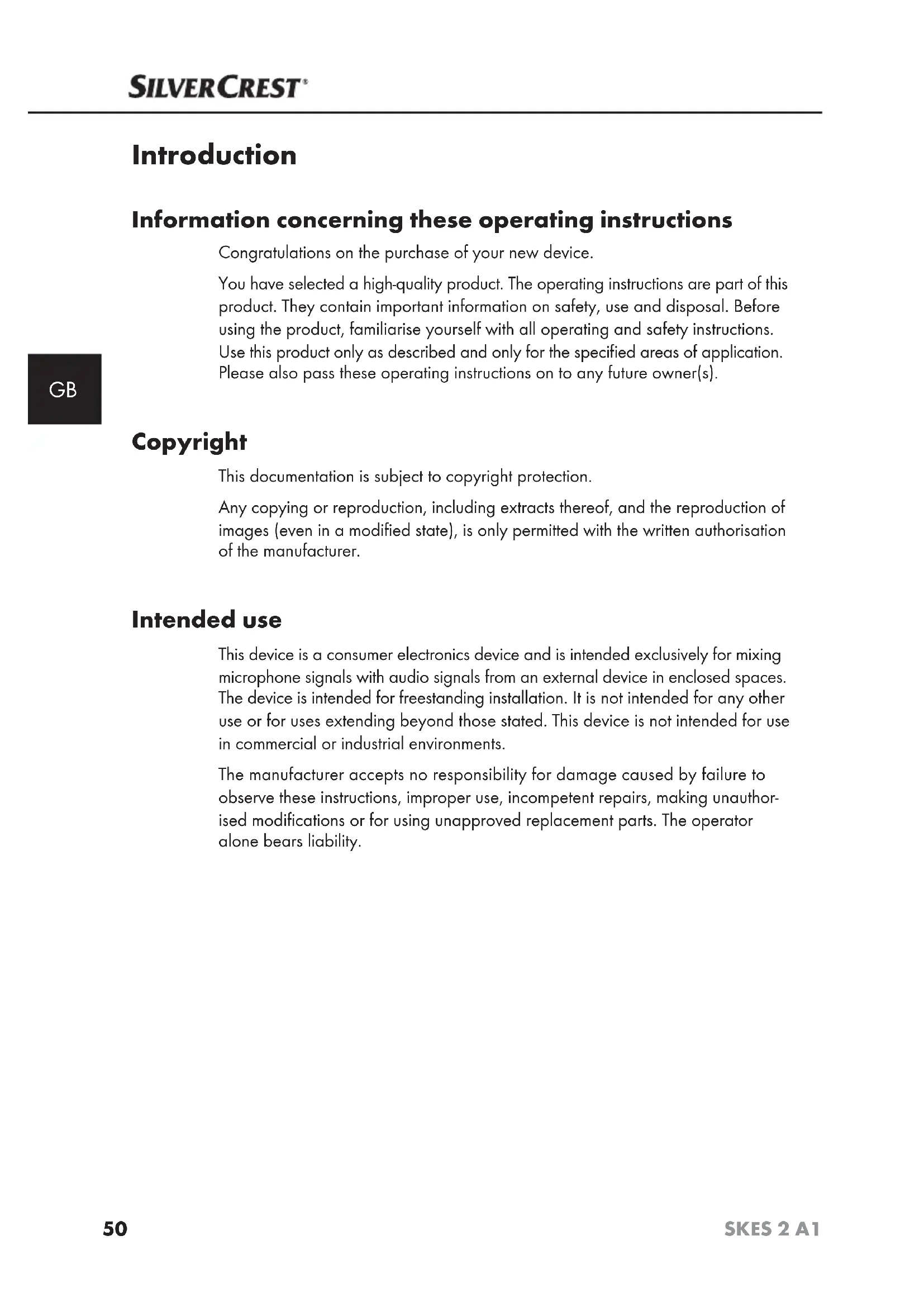 Introduction Information concerning these operating instructions Congratulations on the purchase of your new device. You have selected a high-quality product. The operating instructions are part of this product. They contain important information on safety, use and disposal. Before using the product, familiarise yourself with all operating and safety instructions. Use this product only as described and only for the specified areas of application. Please also pass these operating instructions on to any future owner(s). Copyright This documentation is subject to copyright protection. Any copying or reproduction, including extracts thereof, and the reproduction of images (even in a modified state), is only permitted with the written authorisation of the manufacturer. Intended use This device is a consumer electronics device and is intended exclusively for mixing microphone signals with audio signals from an external device in enclosed spaces. The device is intended for freestanding installation. It is not intended for any other use or for uses extending beyond those stated. This device is not intended for use in commercial or industrial environments. The manufacturer accepts no responsibility for damage caused by failure to observe these instructions, improper use, incompetent repairs, making unauthor- ised modifications or for using unapproved replacement parts. The operator alone bears liability.51 SKES 2 A1
