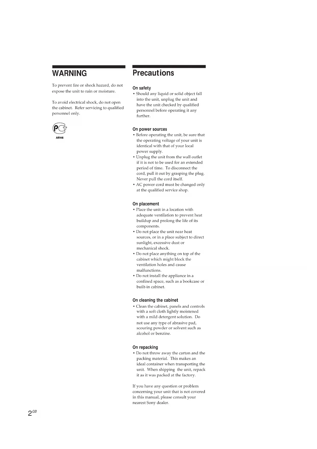 WARNING To prevent fire or shock hazard, do not expose the unit to rain or moisture. To avoid electrical shock, do not open the cabinet. Refer servicing to qualified personnel only. Precautions On safety