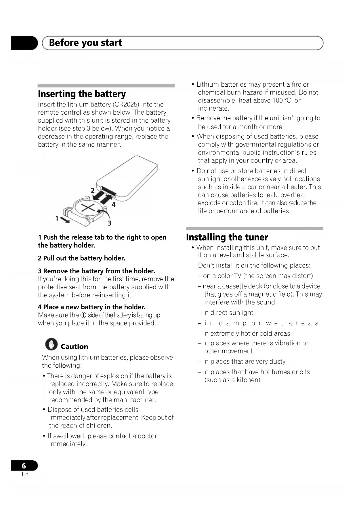 Inserting the battery Insert the lithium battery (CR2025) into the remote control as shown below. The battery supplied with this unit is stored in the battery holder (see step 3 below). When you notice a decrease in the operating range, replace the battery in the same manner. 1 Push the release tab to the right to open the battery holder. 2 Pull out the battery holder. 3 Remove the battery from the holder. If you’re doing this for the first time, remove the protective seal from the battery supplied with the system before re-inserting it. 4 Place a new battery in the holder. Make sure the side of the battery is facing up when you place it in the space provided. Caution When using lithium batteries, please observe the following:
