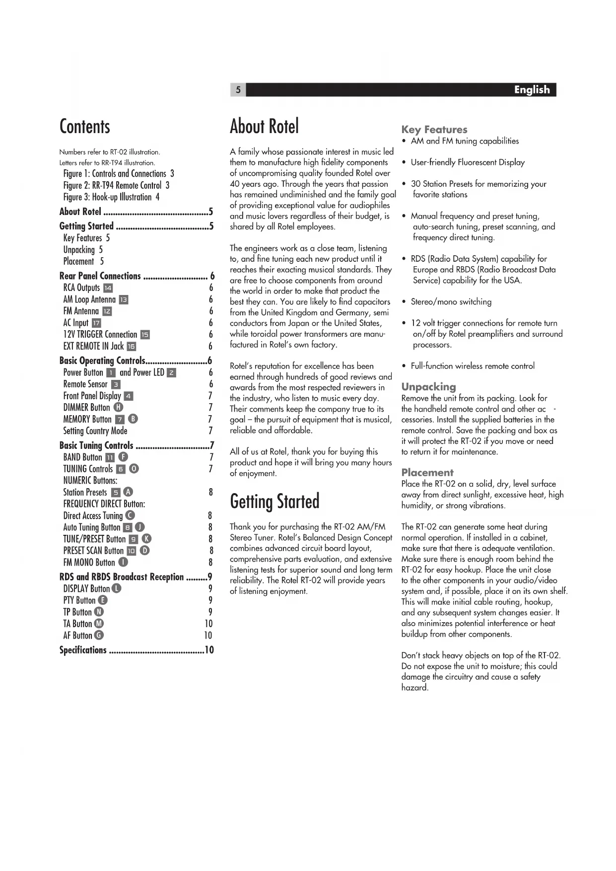 Thank you for purchasing the RT-02 AM/FM Stereo Tuner. Rotel's Balanced Design Concept combines advanced circuit board layout, comprehensive parts evaluation, and extensive listening tests for superior sound and long term reliability. The Rotel RT-02 will provide years of listening enjoyment.