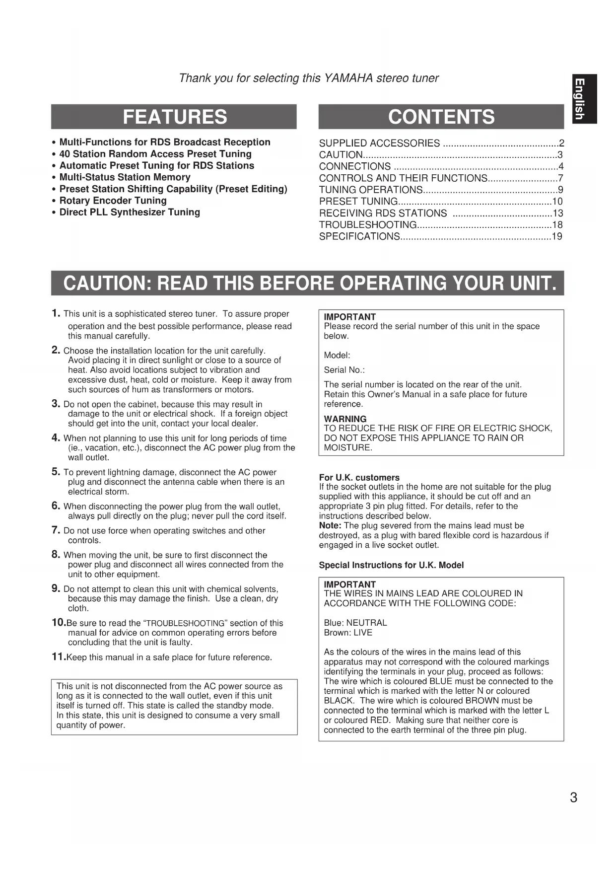 Controleer na het uitpakken of de volgende onderdelen voorhanden zijn.3 English Thank you for selecting this YAMAHA stereo tuner CAUTION: READ THIS BEFORE OPERATING YOUR UNIT. 1. This unit is a sophisticated stereo tuner. To assure properoperation and the best possible performance, please readthis manual carefully.2. Choose the installation location for the unit carefully.Avoid placing it in direct sunlight or close to a source ofheat. Also avoid locations subject to vibration andexcessive dust, heat, cold or moisture. Keep it away fromsuch sources of hum as transformers or motors.3. Do not open the cabinet, because this may result indamage to the unit or electrical shock. If a foreign objectshould get into the unit, contact your local dealer.4. When not planning to use this unit for long periods of time(ie., vacation, etc.), disconnect the AC power plug from thewall outlet.5. To prevent lightning damage, disconnect the AC powerplug and disconnect the antenna cable when there is anelectrical storm.6. When disconnecting the power plug from the wall outlet,always pull directly on the plug; never pull the cord itself.7. Do not use force when operating switches and othercontrols.8. When moving the unit, be sure to first disconnect thepower plug and disconnect all wires connected from theunit to other equipment.9. Do not attempt to clean this unit with chemical solvents,because this may damage the finish. Use a clean, drycloth.10.Be sure to read the “TROUBLESHOOTING” section of thismanual for advice on common operating errors beforeconcluding that the unit is faulty.11.Keep this manual in a safe place for future reference.This unit is not disconnected from the AC power source aslong as it is connected to the wall outlet, even if this unititself is turned off. This state is called the standby mode.In this state, this unit is designed to consume a very smallquantity of power.IMPORTANTPlease record the serial number of this unit in the spacebelow.Model:Serial No.:The serial number is located on the rear of the unit.Retain this Owner’s Manual in a safe place for futurereference.WARNINGTO REDUCE THE RISK OF FIRE OR ELECTRIC SHOCK,DO NOT EXPOSE THIS APPLIANCE TO RAIN ORMOISTURE.For U.K. customersIf the socket outlets in the home are not suitable for the plugsupplied with this appliance, it should be cut off and anappropriate 3 pin plug fitted. For details, refer to theinstructions described below.Note: The plug severed from the mains lead must bedestroyed, as a plug with bared flexible cord is hazardous ifengaged in a live socket outlet.Special Instructions for U.K. ModelIMPORTANTTHE WIRES IN MAINS LEAD ARE COLOURED INACCORDANCE WITH THE FOLLOWING CODE:Blue: NEUTRALBrown: LIVEAs the colours of the wires in the mains lead of thisapparatus may not correspond with the coloured markingsidentifying the terminals in your plug, proceed as follows:The wire which is coloured BLUE must be connected to theterminal which is marked with the letter N or colouredBLACK. The wire which is coloured BROWN must beconnected to the terminal which is marked with the letter Lor coloured RED. Making sure that neither core isconnected to the earth terminal of the three pin plug. FEATURES