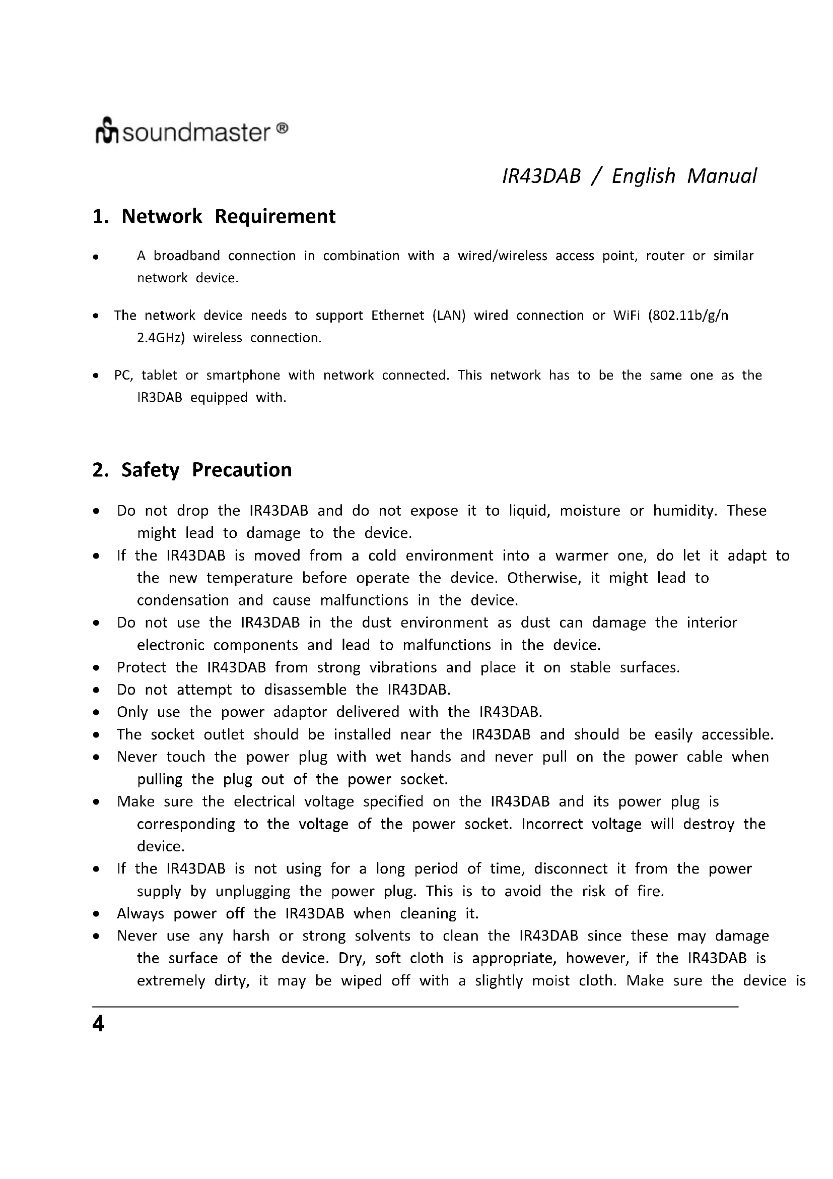 Do not drop the IR43DAB and do not expose it to liquid, moisture or humidity. These might lead to damage to the device. If the IR43DAB is moved from a cold environment into a warmer one, do let it adapt to the new temperature before operate the device. Otherwise, it might lead to condensation and cause malfunctions in the device. Do not use the IR43DAB in the dust environment as dust can damage the interior electronic components and lead to malfunctions in the device. Protect the IR43DAB from strong vibrations and place it on stable surfaces. Do not attempt to disassemble the IR43DAB. Only use the power adaptor delivered with the IR43DAB. The socket outlet should be installed near the IR43DAB and should be easily accessible. Never touch the power plug with wet hands and never pull on the power cable when pulling the plug out of the power socket. Make sure the electrical voltage specified on the IR43DAB and its power plug is corresponding to the voltage of the power socket. Incorrect voltage will destroy the device. If the IR43DAB is not using for a long period of time, disconnect it from the power supply by unplugging the power plug. This is to avoid the risk of fire. Always power off the IR43DAB when cleaning it. Never use any harsh or strong solvents to clean the IR43DAB since these may damage the surface of the device. Dry, soft cloth is appropriate, however, if the IR43DAB is extremely dirty, it may be wiped off with a slightly moist cloth. Make sure the device isIR43DAB / English Manual
