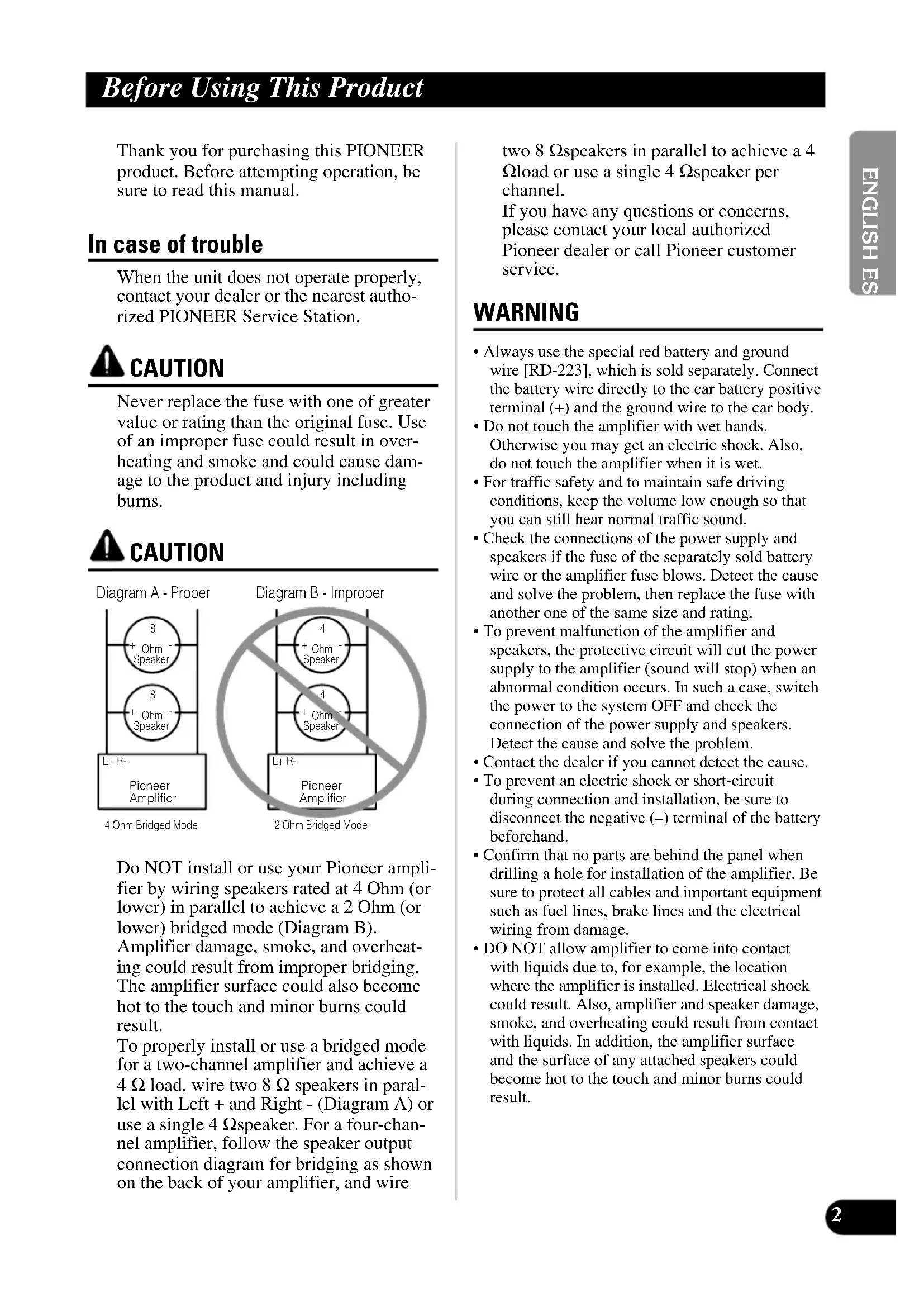 ITALIANO NEDERLANDS Thank you for purchasing this PIONEER product. Before attempting operation, be sure to read this manual. In case of trouble When the unit does not operate properly, contact your dealer or the nearest autho- rized PIONEER Service Station. CAUTION Never replace the fuse with one of greater value or rating than the original fuse. Use of an improper fuse could result in over- heating and smoke and could cause dam- age to the product and injury including burns. CAUTION Do NOT install or use your Pioneer ampli- fier by wiring speakers rated at 4 Ohm (or lower) in parallel to achieve a 2 Ohm (or lower) bridged mode (Diagram B). Amplifier damage, smoke, and overheat- ing could result from improper bridging. The amplifier surface could also become hot to the touch and minor burns could result. To properly install or use a bridged mode for a two-channel amplifier and achieve a 4 Ω load, wire two 8 Ω speakers in paral- lel with Left + and Right - (Diagram A) or use a single 4 Ω speaker. For a four-chan- nel amplifier, follow the speaker output connection diagram for bridging as shown on the back of your amplifier, and wire two 8 Ω speakers in parallel to achieve a 4 Ω load or use a single 4 Ω speaker per channel. If you have any questions or concerns, please contact your local authorized Pioneer dealer or call Pioneer customer service. WARNING