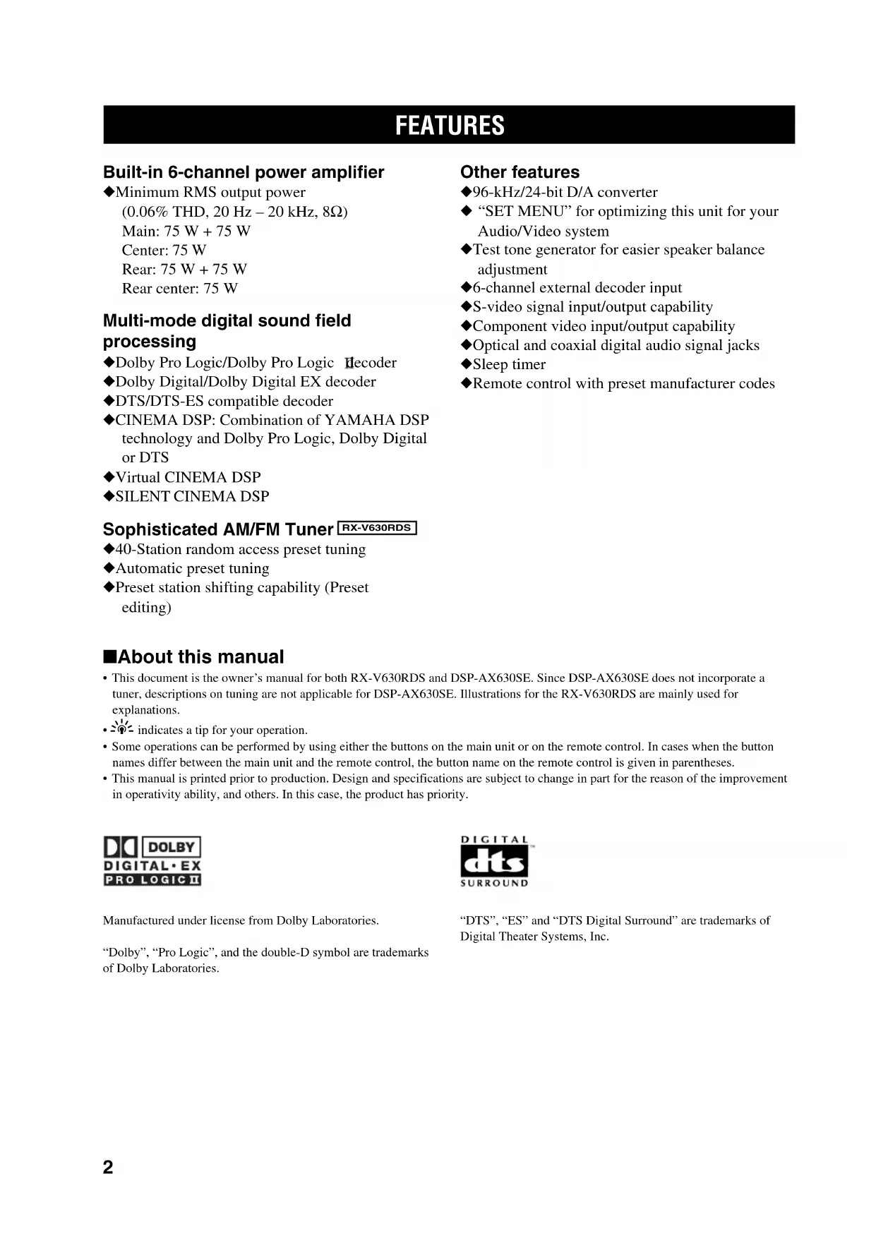 - This document is the owner’s manual for both RX-V630RDS and DSP-AX630SE. Since DSP-AX630SE does not incorporate a tuner, descriptions on tuning are not applicable for DSP-AX630SE. Illustrations for the RX-V630RDS are mainly used for explanations.