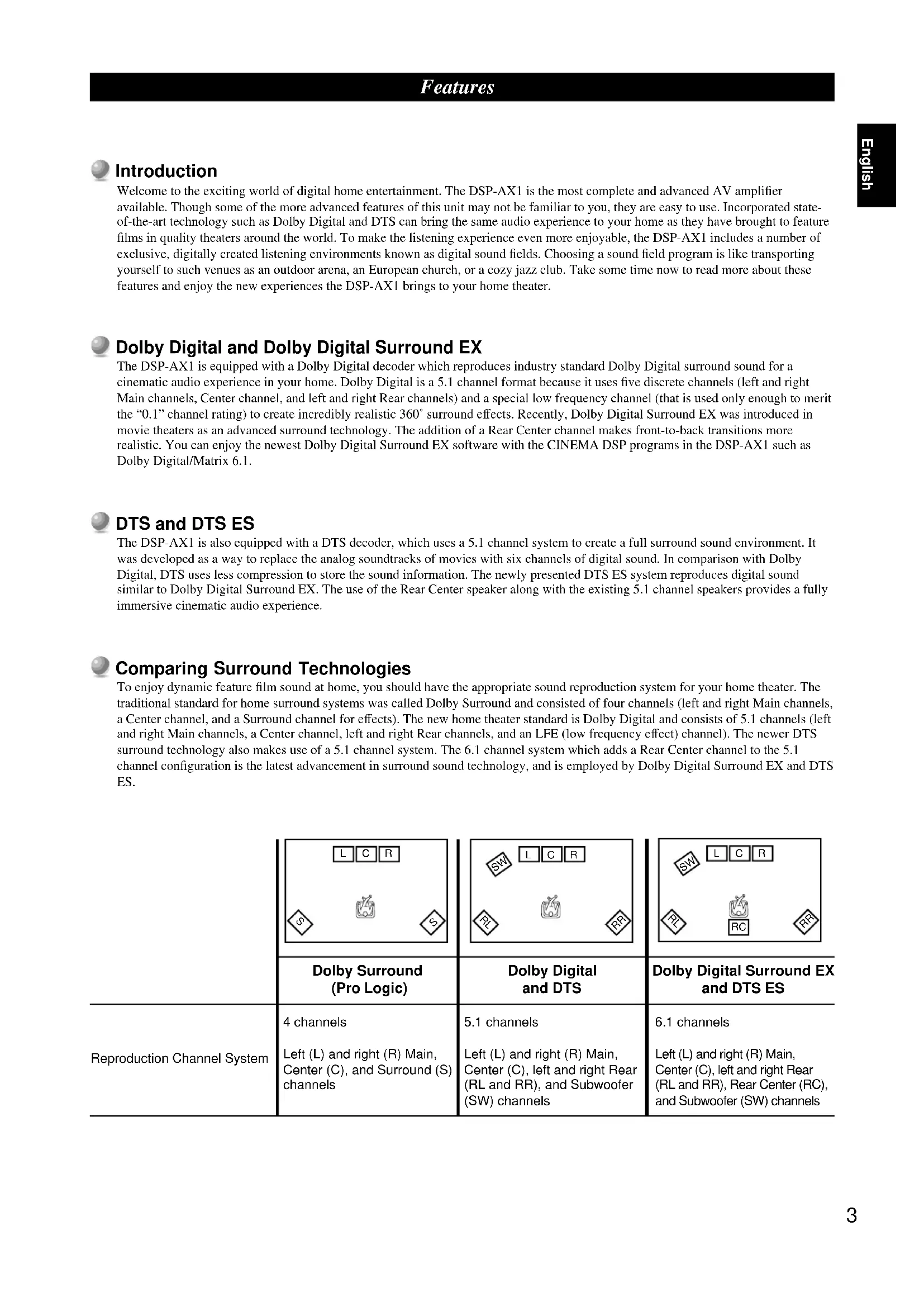 - Rear Panel English Introduction Welcome to the exciting world of digital home entertainment. The DSP-AX1 is the most complete and advanced AV amplifier available. Though some of the more advanced features of this unit may not be familiar to you, they are easy to use. Incorporated state- of-the-art technology such as Dolby Digital and DTS can bring the same audio experience to your home as they have brought to feature films in quality theaters around the world. To make the listening experience even more enjoyable, the DSP-AX1 includes a number of exclusive, digitally created listening environments known as digital sound fields. Choosing a sound field program is like transporting yourself to such venues as an outdoor arena, an European church, or a cozy jazz club. Take some time now to read more about these features and enjoy the new experiences the DSP-AX1 brings to your home theater. Dolby Digital and Dolby Digital Surround EX The DSP-AX1 is equipped with a Dolby Digital decoder which reproduces industry standard Dolby Digital surround sound for a cinematic audio experience in your home. Dolby Digital is a 5.1 channel format because it uses five discrete channels (left and right Main channels, Center channel, and left and right Rear channels) and a special low frequency channel (that is used only enough to merit the “0.1” channel rating) to create incredibly realistic 360˚ surround effects. Recently, Dolby Digital Surround EX was introduced in movie theaters as an advanced surround technology. The addition of a Rear Center channel makes front-to-back transitions more realistic. You can enjoy the newest Dolby Digital Surround EX software with the CINEMA DSP programs in the DSP-AX1 such as Dolby Digital/Matrix 6.1. DTS and DTS ES The DSP-AX1 is also equipped with a DTS decoder, which uses a 5.1 channel system to create a full surround sound environment. It was developed as a way to replace the analog soundtracks of movies with six channels of digital sound. In comparison with Dolby Digital, DTS uses less compression to store the sound information. The newly presented DTS ES system reproduces digital sound similar to Dolby Digital Surround EX. The use of the Rear Center speaker along with the existing 5.1 channel speakers provides a fully immersive cinematic audio experience. Comparing Surround Technologies To enjoy dynamic feature film sound at home, you should have the appropriate sound reproduction system for your home theater. The traditional standard for home surround systems was called Dolby Surround and consisted of four channels (left and right Main channels, a Center channel, and a Surround channel for effects). The new home theater standard is Dolby Digital and consists of 5.1 channels (left and right Main channels, a Center channel, left and right Rear channels, and an LFE (low frequency effect) channel). The newer DTS surround technology also makes use of a 5.1 channel system. The 6.1 channel system which adds a Rear Center channel to the 5.1 channel configuration is the latest advancement in surround sound technology, and is employed by Dolby Digital Surround EX and DTS ES. Features Reproduction Channel System 4 channels Left (L) and right (R) Main, Center (C), and Surround (S) channels p. 113