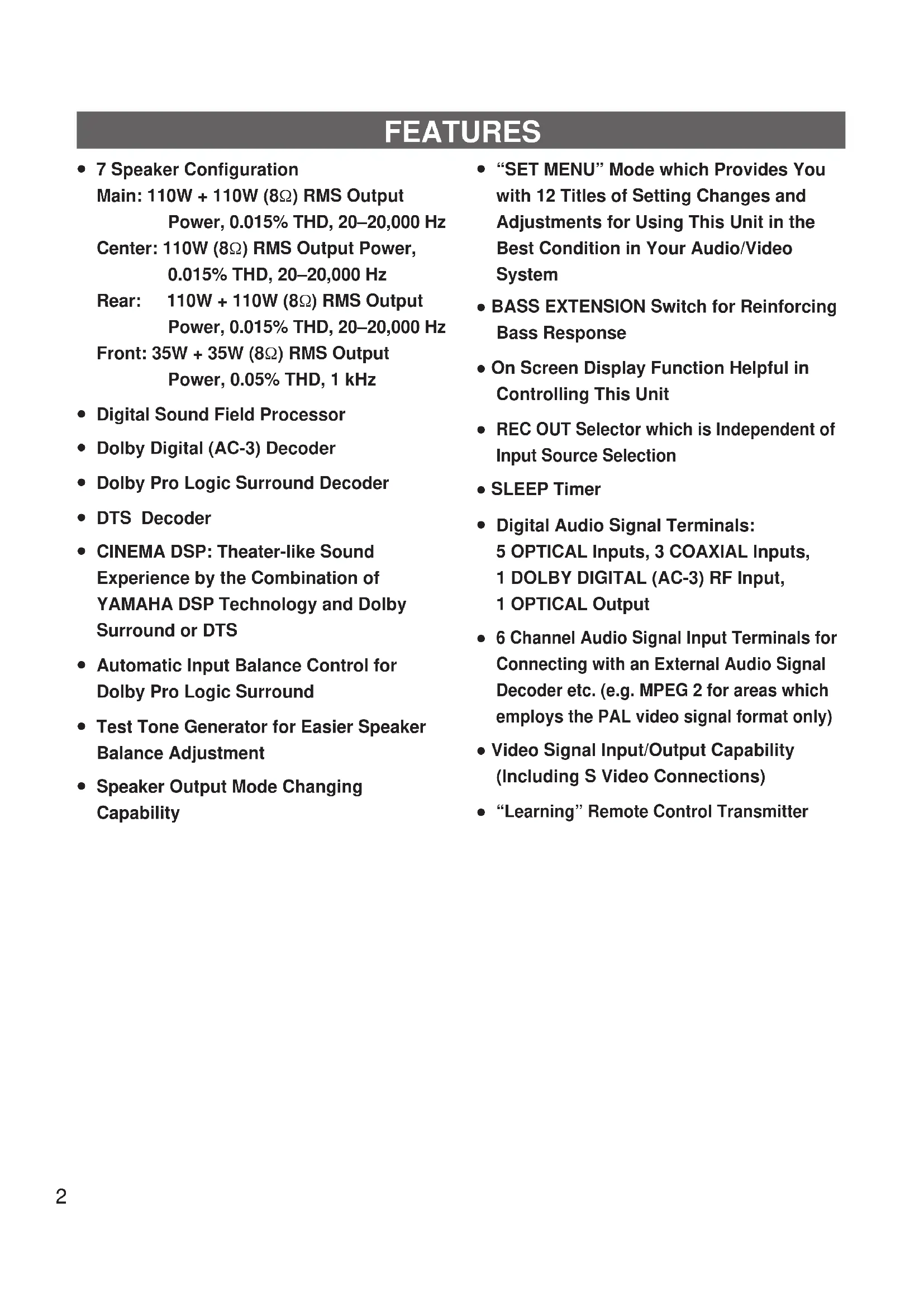 This unit incorporates a sophisticated, multi-program digital sound field processor. The processor allows you to electronically expand and change the shape of the audio sound field from both audio and video sources, creating a theater-like experience in your listening room. This unit has a total of 12 digital sound field processor (DSP) modes. You can create an excellent audio sound field by selecting a suitable sound field (this will, of course, depend on what you will be listening to), and adding desired adjustments. In addition, this unit incorporates a Dolby Pro Logic Surround decoder and Dolby Digital (AC-3) decoder for multi-channel sound reproduction of Dolby Surround encoded video sources, and a DTS decoder for multi-channel sound reproduction of DTS- encoded audio and video sources. The operation of the Dolby Pro Logic Surround, Dolby Digital (AC-3) or DTS decoder can be controlled by selecting a corresponding DSP program including combined operations of DSP and Dolby Pro Logic Surround, DSP and Dolby Digital (AC-3), or DSP and DTS. This unit also features a built-in automatic input balance control. This always assures you the best performance without manual adjustment. Digital Sound Field Processing What is it that makes live music so good? Today’s advanced sound reproduction technology lets you get extremely close to the sound of a live performance, but chances are you’ll still notice something missing, the acoustic environment of the live concert hall. Extensive research into the exact nature of the sonic reflections that create the ambience of a large hall has made it possible for Yamaha engineers to bring you this same sound in your own listening room, so you’ll feel all the sound of a live concert. Furthermore, our technicians, armed with sophisticated measuring equipment, have even made it possible to capture the acoustics of a variety of actual concert halls, jazz clubs, theaters, etc. from around the world, to allow you to accurately recreate any one of these live performance environments, all in your own home. Dolby Pro Logic Surround This unit employs a Dolby Pro Logic Surround decoder similar to professional Dolby Stereo decoders used in many movie theaters. By using the Dolby Pro Logic Surround decoder, you can experience the dramatic realism and impact of Dolby Stereo theater sound in your own home. Dolby Pro Logic employs a four-channel-five-speaker system. The Pro Logic Surround system divides the input signal into four levels: the left and right main channels, the center channel (used for dialog), and the rear surround sound channel (used for sound effects, background noise, and other ambient noises). The center channel allows listeners seated in even less-than-ideal positions to hear the dialog originating from the action on the screen while experiencing good stereo imaging. Dolby Surround is encoded on a lot of sound tracks of pre- recorded video tapes, laserdiscs, and some TV/cable broadcasts. When you play a source encoded with Dolby Surround on this unit, the Dolby Pro Logic Surround decoder decodes the signal and distributes the surround-sound effects. Dolby Digital (AC-3) Dolby Digital (AC-3) is a new generation of Dolby Surround sound system which is a spatial sound processing format developed for 35 mm film-movies by employing low bit-rate audio coding. Dolby Digital (AC-3) is a digital surround sound system that provides completely independent multi-channel audio to consumers. In multi-channel form, Dolby Digital (AC-3) provides five full range channels in what is sometimes referred to as a “3/2” configuration: three front channels (left, center and right), plus two surround channels. A sixth bass-only effect channel is also provided for output of LFE (low frequency effect), or low bass effects that are independent of other channels. (This is called the “subwoofer channel” or “LFE channel”.) This channel is counted as 0.1, thus giving rise to the term 5.1 channels in total. Compared to Dolby Pro Logic that is referred to a “3/1” system (left front, center, right front and just one surround channel), Dolby Digital (AC-3) features two surround channels, called stereo or split surrounds, each offering the same full range fidelity as the three front channels. By using the built-in Dolby Digital (AC-3) decoder, you can experience the dramatic realism and impact of Dolby Stereo Digital theater sound in your own home. Sound of wide dynamic range reproduced by the five full range channels presents listeners much excitement that has never been experienced before. Precise sound orientation by the discrete digital sound processing expands realism that the original movie possesses.The DTS (Digital Theater Systems) system was developed to replace analog soundtracks of movies with six discrete channels of digital soundtracks, and now, it is installed in many theaters around the world. The DTS digital playback system changed the way we experienced movies in theaters with six discrete channels of superb digital audio. The DTS technology, through intense research and development, made it possible to deliver a similar encode/decode discrete technology to home audio surround- sound entertainment. The DTS Digital Surround is an encode/decode system which delivers six channels of master-quality, 20-bit audio; technically