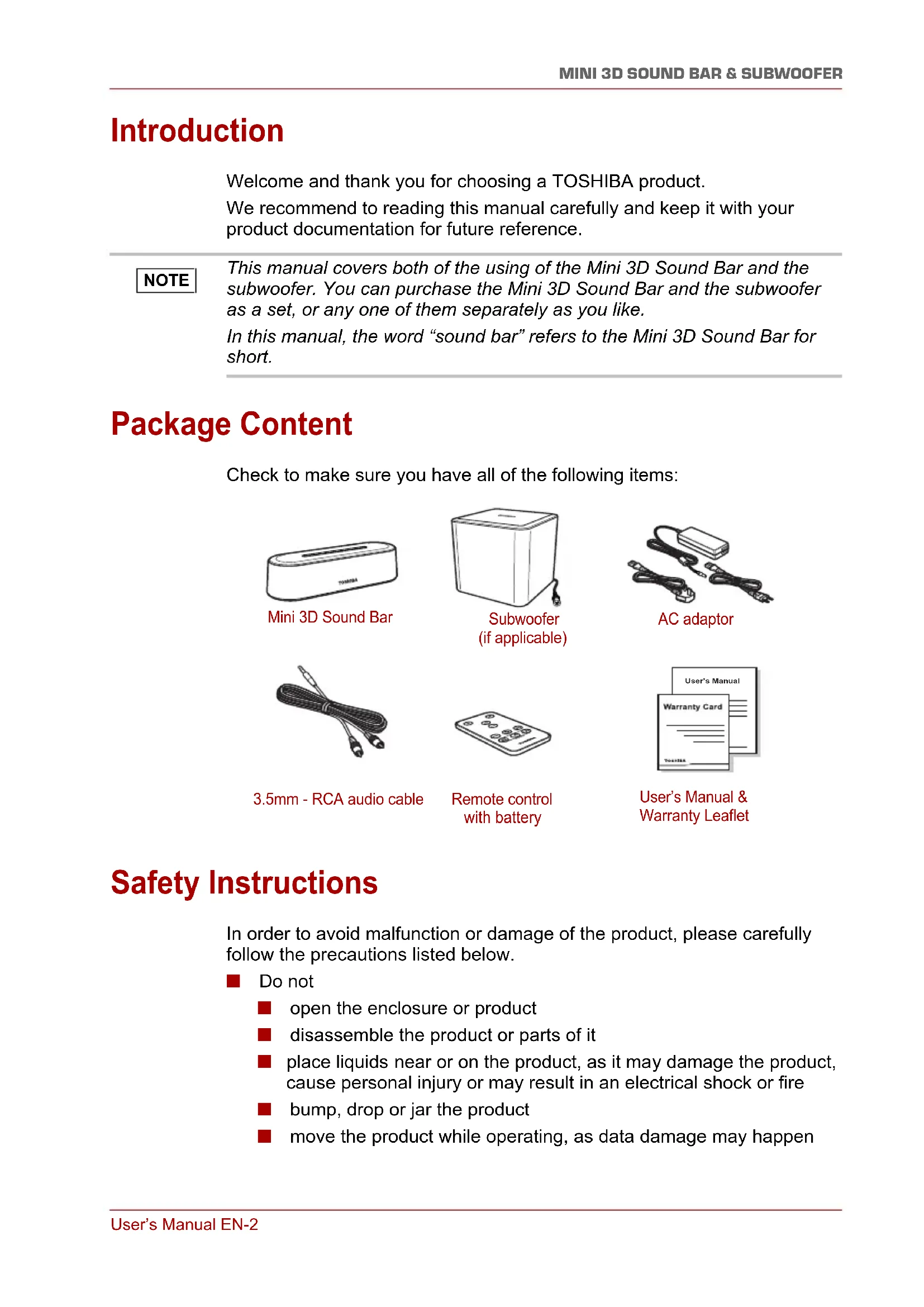 Introduction Welcome and thank you for choosing a TOSHIBA product. We recommend to reading this manual carefully and keep it with your product documentation for future reference. Package Content Check to make sure you have all of the following items: Safety Instructions In order to avoid malfunction or damage of the product, please carefully follow the precautions listed below. ■ Do not ■ open the enclosure or product ■ disassemble the product or parts of it ■ place liquids near or on the product, as it may damage the product, cause personal injury or may result in an electrical shock or fire ■ bump, drop or jar the product ■ move the product while operating, as data damage may happen This manual covers both of the using of the Mini 3D Sound Bar and the subwoofer. You can purchase the Mini 3D Sound Bar and the subwoofer as a set, or any one of them separately as you like. In this manual, the word “sound bar” refers to the Mini 3D Sound Bar for short. NOTE User’s Manual Mini 3D Sound Bar Subwoofer (if applicable) AC adaptor 3.5mm - RCA audio cable Remote control with battery User’s Manual & Warranty LeafletEN-3 User’s Manual