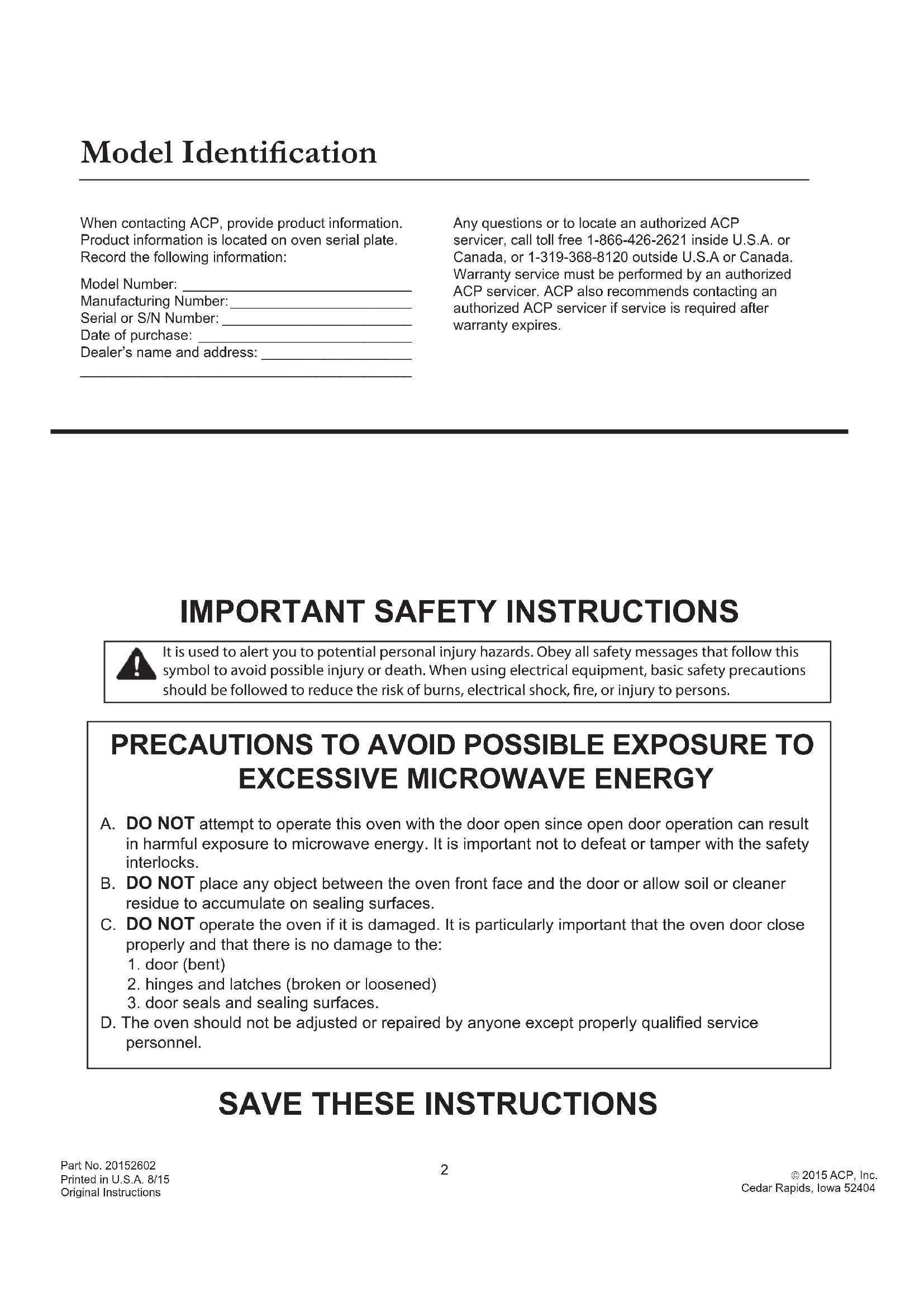 2015 ACP, Inc.Cedar Rapids, Iowa 52404IMPORTANT SAFETY INSTRUCTIONS