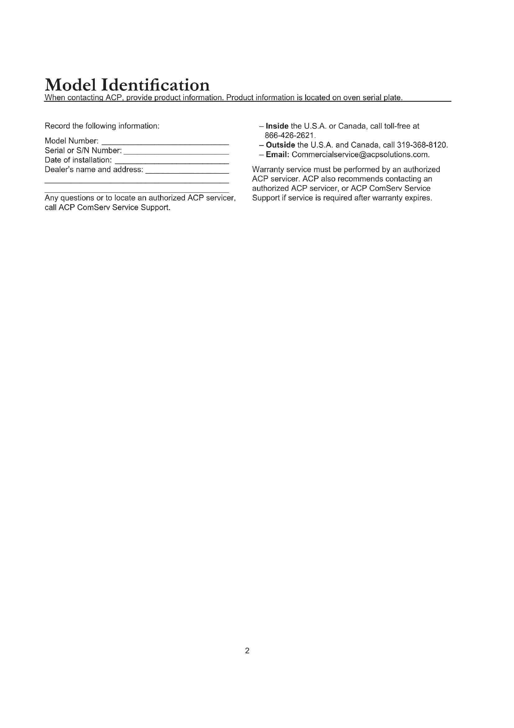 This manual covers model: ACE* Original Instruction2 – Inside the U.S.A. or Canada, call toll-free at 866-426-2621. – Outside the U.S.A. and Canada, call 319-368-8120. – Email: Commercialservice@acpsolutions.com. Warranty service must be performed by an authorized ACP servicer. ACP also recommends contacting an authorized ACP servicer, or ACP ComServ Service Support if service is required after warranty expires. Model Identication When contacting ACP, provide product information. Product information is located on oven serial plate. Record the following information: Model Number: _____________________________ Serial or S/N Number: ________________________ Date of installation: __________________________ Dealer’s name and address: ___________________