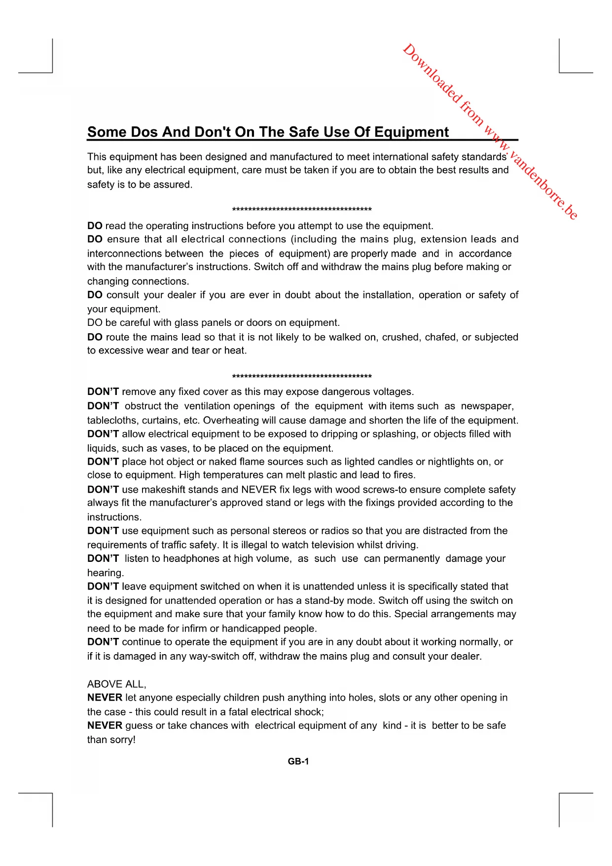 DON’T remove any xed cover as this may expose dangerous voltages. DON’T obstruct the ventilation openings of the equipment with items such as newspaper, tablecloths, curtains, etc. Overheating will cause damage and shorten the life of the equipment. DON’T allow electrical equipment to be exposed to dripping or splashing, or objects lled with liquids, such as vases, to be placed on the equipment. DON’T place hot object or naked ame sources such as lighted candles or nightlights on, or close to equipment. High temperatures can melt plastic and lead to res. DON’T use makeshift stands and NEVER x legs with wood screws-to ensure complete safety always t the manufacturer’s approved stand or legs with the xings provided according to the instructions. DON’T use equipment such as personal stereos or radios so that you are distracted from the requirements of trafc safety. It is illegal to watch television whilst driving. DON’T listen to headphones at high volume, as such use can permanently damage your hearing. DON’T leave equipment switched on when it is unattended unless it is specically stated that it is designed for unattended operation or has a stand-by mode. Switch off using the switch on the equipment and make sure that your family know how to do this. Special arrangements may need to be made for inrm or handicapped people. DON’T continue to operate the equipment if you are in any doubt about it working normally, or if it is damaged in any way-switch off, withdraw the mains plug and consult your dealer. ABOVE ALL, NEVER let anyone especially children push anything into holes, slots or any other opening in the case - this could result in a fatal electrical shock; NEVER guess or take chances with electrical equipment of any kind - it is better to be safe than sorry! Downloaded from www.vandenborre.beGB-2