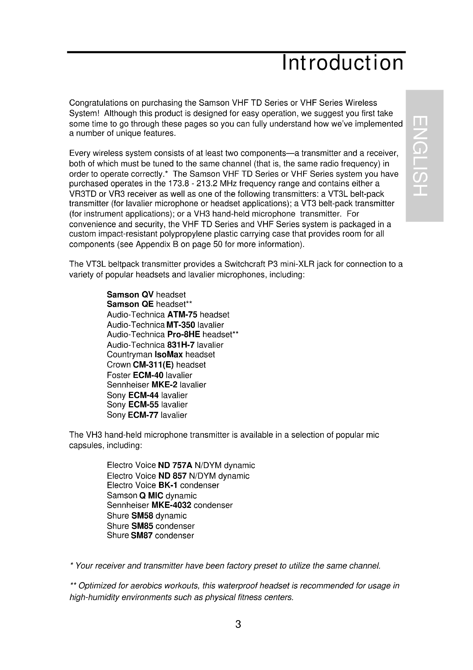 ENGLISHIntroduction The VR3 receiver provided with the VHF Series wireless system utilizes non-diversity technology, incorporating a single antenna for ease of use and minimal cost. The VR3TD receiver provided with the VHF TD Series system utilizes a patented technological breakthrough called “Microprocessor True Diversity,” whereby a single chassis houses two antennas (called “Antenna A” and “Antenna B”) and a receiver circuit. A built-in computer chip continuously scans RF signals from the two antennas and determines which one has the clearest and strongest reception, automatically (and silently) switching that signal to the receiver. This allows you to maintain the wireless communication link over a much broader area range than would be allowed by a receiver utilizing a single antenna and also virtually eliminates multipath dropouts, interference and phase cancellation problems. In addition, special sample-and-hold linking circuitry ensures that correct phase correlation is maintained at all times, with no noise or pops during antenna switching. The result is performance which exceeds that of conventional antenna true diversity systems and the highest quality audio fidelity available in any wireless system. Finally, the provision of Signetics® noise reduction produces crystal-clear sound with minimized background noise and hiss. In this manual, you’ll find a more detailed description of the features of your VHF TD Series or VHF Series system, as well as a guided tour through all components, step-by- step instructions for setting up and using your system and full specifications. If your VHF TD Series or VHF Series system was purchased in the United States, you’ll also find a warranty card enclosed—don’t forget to fill it out and mail it! This will enable you to receive online technical support and will allow us to send you updated information about other Samson products in the future. If your VHF TD Series or VHF Series system was purchased outside of the United States, contact your local distributor for warranty details. SPECIAL NOTE for U.S. purchasers: Should your VHF TD Series or VHF Series system ever require servicing, a Return Authorization number (RA) is necessary. Without this number, the unit will not be accepted. Please call Samson at 1-800-372-6766 for a Return Authorization number prior to shipping your unit. Please retain the original packing materials and, if possible, return the unit in its original carton and packing materials. If your VHF TD Series or VHF Series system was purchased outside of the United States, contact your local distributor for servicing information.