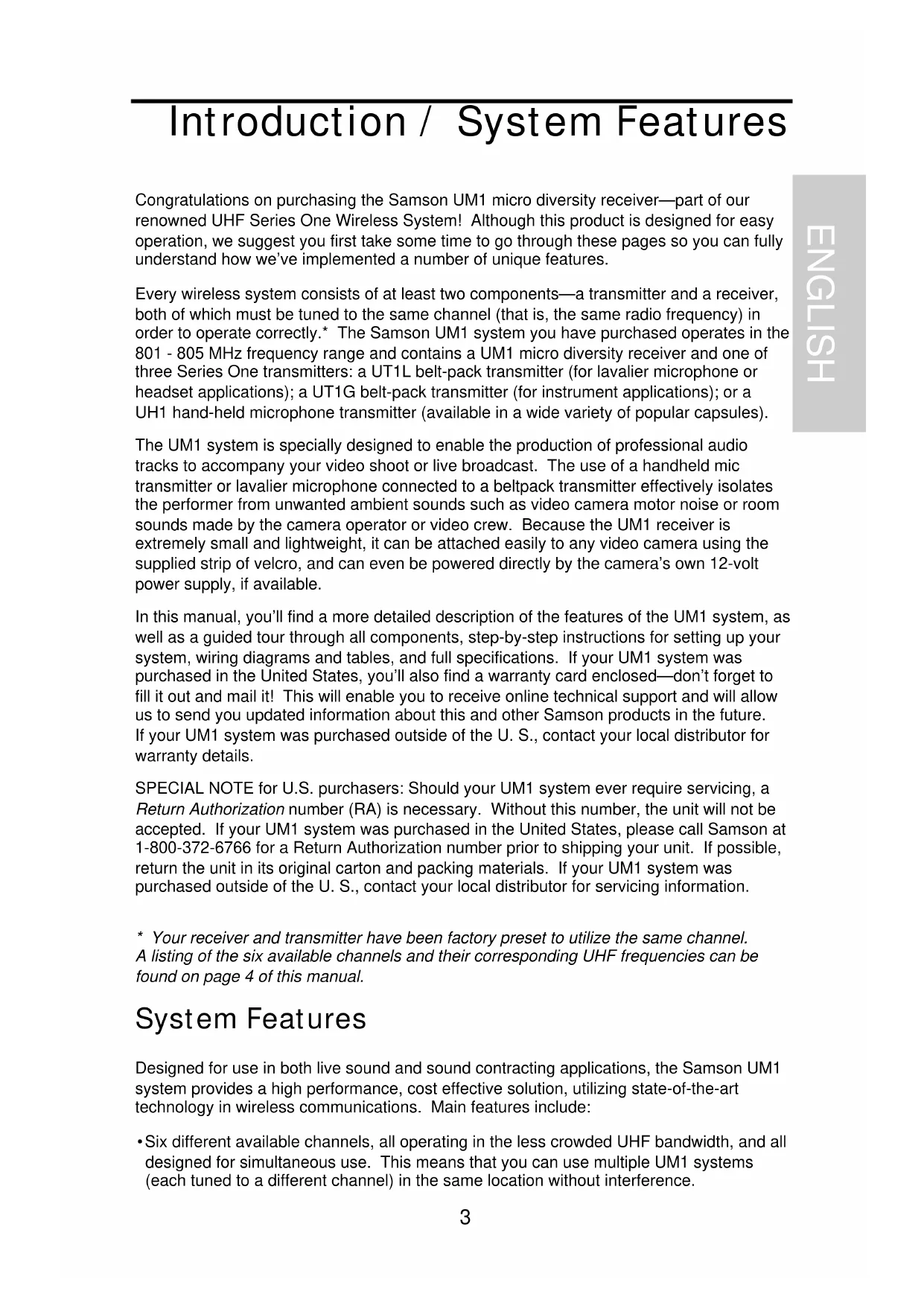 SPECIAL NOTE for U.S. purchasers: Should your UM1 system ever require servicing, a Return Authorization number (RA) is necessary. Without this number, the unit will not be accepted. If your UM1 system was purchased in the United States, please call Samson at 1-800-372-6766 for a Return Authorization number prior to shipping your unit. If possible, return the unit in its original carton and packing materials. If your UM1 system was purchased outside of the U.S., contact your local distributor for servicing information.