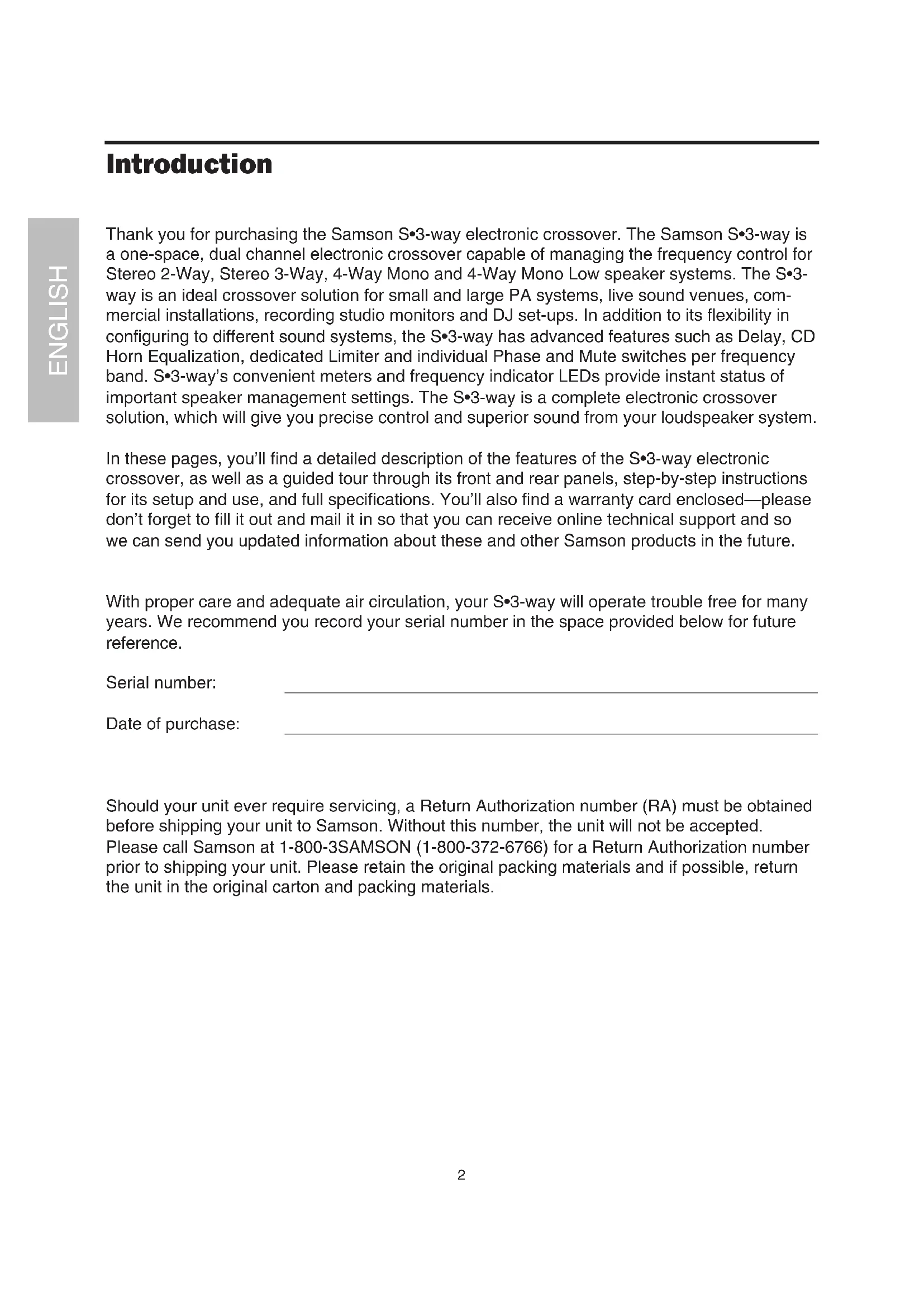 The lightning flash with an arrowhead symbol within an equilateral triangle, is intended to alert the user to the presence of uninsulated "dangerous voltage" within the products enclosure that may be of sufficient magnitude to constitute a risk of electric shock to persons. The exclamation point within an equilateral triangle is intended to alert the user to the presence of important operating and maintenance (servicing) instructions in the literature accompanying the product.1 Copyright 2001, Samson Technologies Corp. Printed May, 2001 Samson Technologies Corp. 575 Underhill Blvd. P.O. Box 9031 Syosset, NY 11791-9031 Phone: 1-800-3-SAMSON (1-800-372-6766) Fax: 516-364-3888 www.samsontech.com Table of Contents Table des matières Inhalt Contenido ENGLISH Introduction 2 S•3-way Features 3 Controls and Functions Front Panel Layout 4-5 Rear Panel Layout 4-5 Operating the S 3•Way Setting Up the S•3-way 6 Setting up the S•3-way for Stereo 3-way Operation 7-9 S•3-way Controls 10 S 3•Way System Set-Ups Stereo 2-way Operation 11 Stereo 3-way Operation 12 Mono 4-way Operation 13 Mono 4-way Low Operation 14 S•3-way Connections 15 Addendum: Setting up the S•3 way using a Real Time Analyzer 16-17 Specifications 61 Block Diagram 62 FRANÇAIS Présentation du S•3-Way 19 Commandes et fonctions Face avant 20–21 Face arrière 20–21 Utilisation des fonctions du S 3•Way Configuration du S•3-way 22 Configuration 3 voies stéréo du S•3-way 23–25 Utilisation des fonctions du S•3-way 26 Configurations du système S 3•Way Configuration 2 voies stéréo 27 Configuration 3 voies stéréo 28 Configuration 4 voies mono 29 Configuration 4 voies mono pour Subwoofers 30 Annexes A : Configuration du S•3-way à l’aide d’un analyseur en temps réel 32–32 Caractéristiques techniques 61 Synoptique 62 DEUTSCHE S•3-way Funktionen 33 Regler und Funktionen Vorderseite 34–35 Rückseite 34–35 S 3•Way bedienen S•3-way einrichten 36 S•3-way für den 3-Weg Stereo-Betrieb einrichten 37–39 S•3-way Regler 40 S 3•Way System-Einrichtungen 2-Weg Stereo-Betrieb 41 3-Weg Stereo-Betrieb 42 4-Weg Mono-Betrieb 43 4-Weg Mono Low-Betrieb 44 Anhang A: S•3-way mit Echtzeit-Analyzer einrichten 45–46 Technische Daten 61 Blockdiagram 62 ESPAÑOL Características del S•3-way 47 Controles y funciones Distribución del panel frontal 48–49 Distribución del panel posterior 48–49 Utilizar el S 3•Way Instalar el S•3-way 50 Configurar el S•3-way para el modo estéreo de 3 vías 51–53 Controles del S•3-way 54 Configuraciones del sistema S 3•Way Modo estéreo de 2 vías 55 Modo estéreo de 3 vías 56 Modo mono de 4 vías 57 Modo mono de 4 vías para graves 58 Apéndice A: Configurar el S•3-way con un Analizador en Tiempo Real (RTA) 59–60 Especificaciones 61 Diagrama de bloque 622 Thank you for purchasing the Samson S•3-way electronic crossover. The Samson S•3-way is a one-space, dual channel electronic crossover capable of managing the frequency control for Stereo 2-Way, Stereo 3-Way, 4-Way Mono and 4-Way Mono Low speaker systems. The S•3- way is an ideal crossover solution for small and large PA systems, live sound venues, com- mercial installations, recording studio monitors and DJ set-ups. In addition to its flexibility in configuring to different sound systems, the S•3-way has advanced features such as Delay, CD Horn Equalization, dedicated Limiter and individual Phase and Mute switches per frequency band. S•3-way’s convenient meters and frequency indicator LEDs provide instant status of important speaker management settings. The S•3-way is a complete electronic crossover solution, which will give you precise control and superior sound from your loudspeaker system. In these pages, you’ll find a detailed description of the features of the S•3-way electronic crossover, as well as a guided tour through its front and rear panels, step-by-step instructions for its setup and use, and full specifications. You’ll also find a warranty card enclosed—please don’t forget to fill it out and mail it in so that you can receive online technical support and so we can send you updated information about these and other Samson products in the future. With proper care and adequate air circulation, your S•3-way will operate trouble free for many years. We recommend you record your serial number in the space provided below for future reference. Serial number: Date of purchase: Should your unit ever require servicing, a Return Authorization number (RA) must be obtained before shipping your unit to Samson. Without this number, the unit will not be accepted. Please call Samson at 1-800-3SAMSON (1-800-372-6766) for a Return Authorization number prior to shipping your unit. Please retain the original packing materials and if possible, return the unit in the original carton and packing materials. Introduction ENGLISH3 S•3-Way Features The Samson S•3-way electronic crossover utilizes the latest technology in speaker management design. Here are some of its main features: