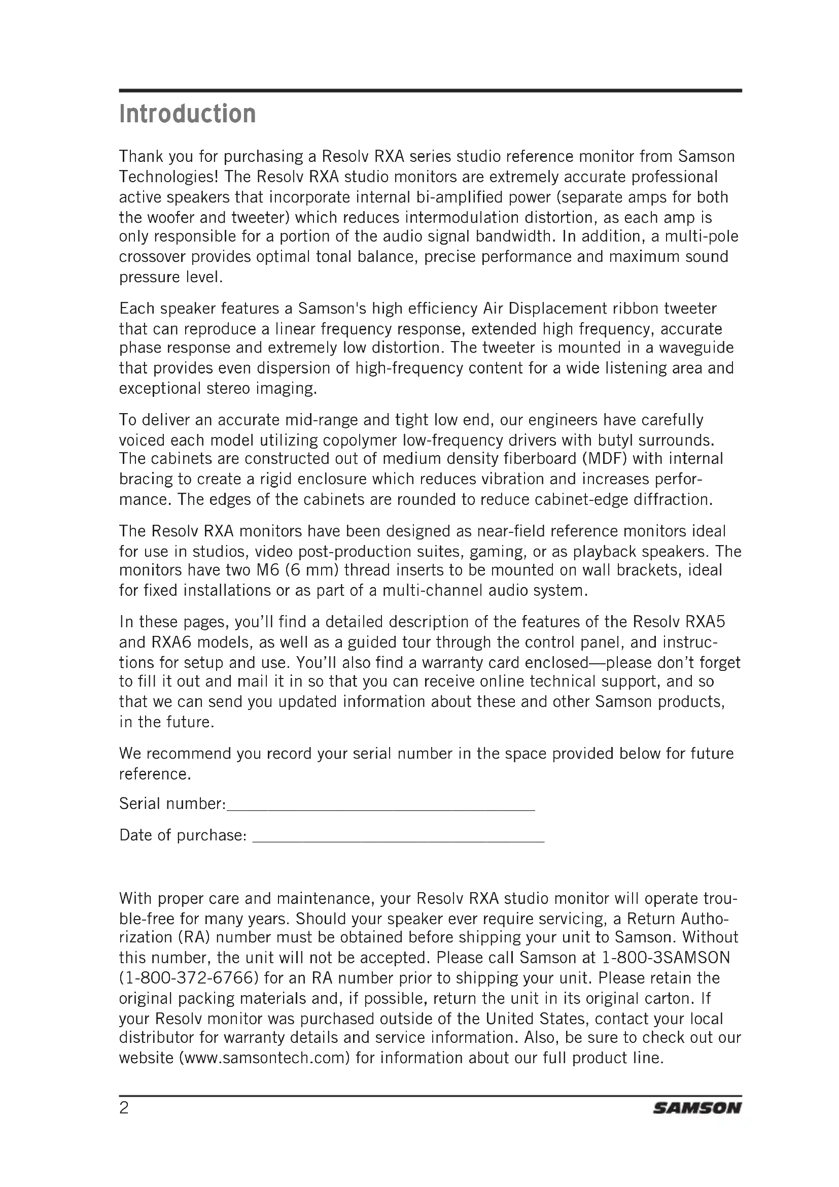 Resolv RXA Studio MonitorsThank you for purchasing a Resolv RXA series studio reference monitor from Samson Technologies! The Resolv RXA studio monitors are extremely accurate professional active speakers that incorporate internal bi-amplified power (separate amps for both the woofer and tweeter) which reduces intermodulation distortion, as each amp is only responsible for a portion of the audio signal bandwidth. In addition, a multi-pole crossover provides optimal tonal balance, precise performance and maximum sound pressure level. Each speaker features a Samson's high efficiency Air Displacement ribbon tweeter that can reproduce a linear frequency response, extended high frequency, accurate phase response and extremely low distortion. The tweeter is mounted in a waveguide that provides even dispersion of high-frequency content for a wide listening area and exceptional stereo imaging. To deliver an accurate mid-range and tight low end, our engineers have carefully voiced each model utilizing copolymer low-frequency drivers with butyl surrounds. The cabinets are constructed out of medium density fiberboard (MDF) with internal bracing to create a rigid enclosure which reduces vibration and increases perfor- mance. The edges of the cabinets are rounded to reduce cabinet-edge diffraction. The Resolv RXA monitors have been designed as near-field reference monitors ideal for use in studios, video post-production suites, gaming, or as playback speakers. The monitors have two M6 (6 mm) thread inserts to be mounted on wall brackets, ideal for fixed installations or as part of a multi-channel audio system. In these pages, you’ll find a detailed description of the features of the Resolv RXA5 and RXA6 models, as well as a guided tour through the control panel, and instruc- tions for setup and use. You’ll also find a warranty card enclosed—please don’t forget to fill it out and mail it in so that you can receive online technical support, and so that we can send you updated information about these and other Samson products, in the future. We recommend you record your serial number in the space provided below for future reference. Serial number:_____________________________________ Date of purchase: ___________________________________ With proper care and maintenance, your Resolv RXA studio monitor will operate trou- ble-free for many years. Should your speaker ever require servicing, a Return Autho- rization (RA) number must be obtained before shipping your unit to Samson. Without this number, the unit will not be accepted. Please call Samson at 1-800-3SAMSON (1-800-372-6766) for an RA number prior to shipping your unit. Please retain the original packing materials and, if possible, return the unit in its original carton. If your Resolv monitor was purchased outside of the United States, contact your local distributor for warranty details and service information. Also, be sure to check out our website (www.samsontech.com) for information about our full product line. Introduction 2ENGLISH