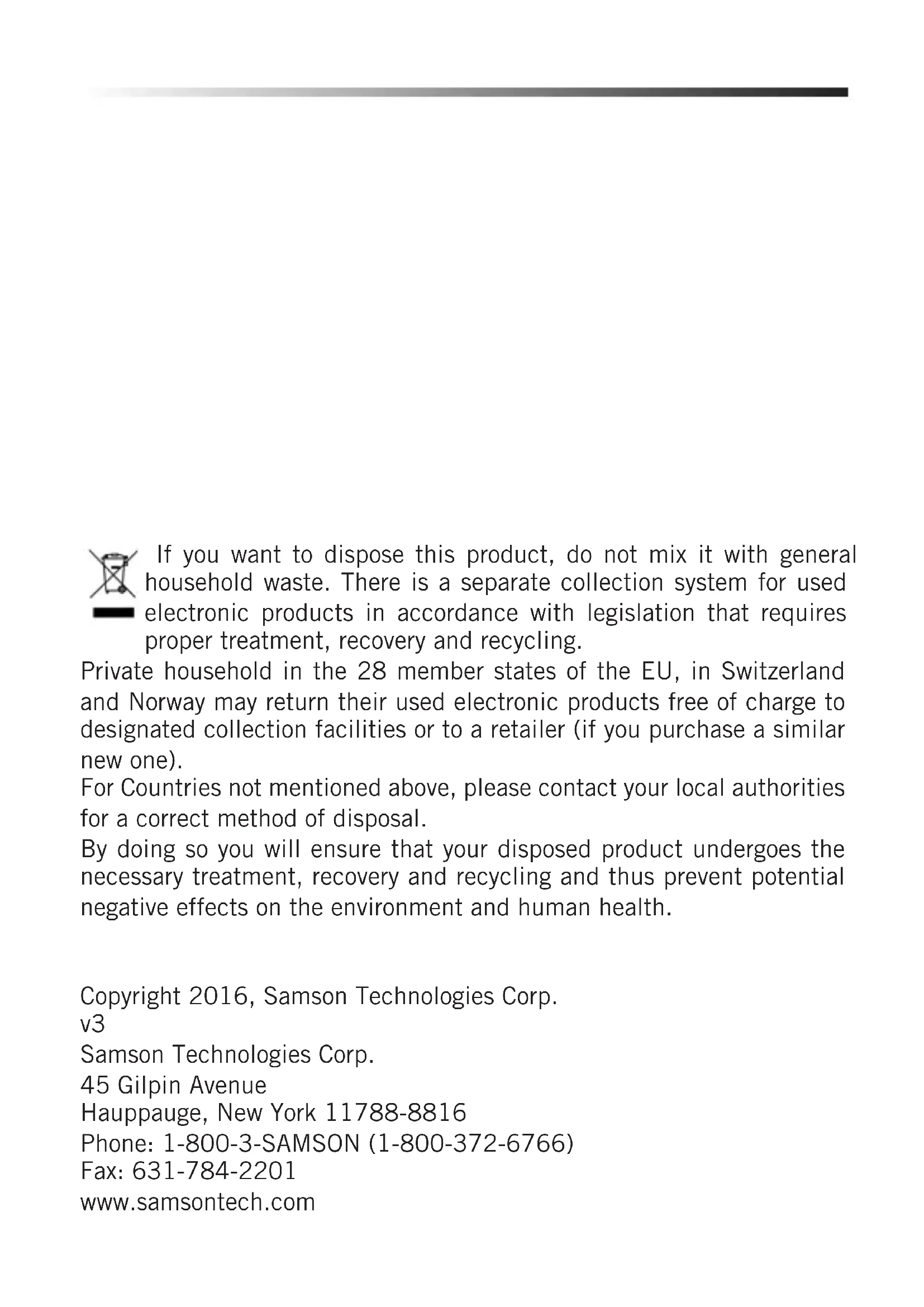 With proper care and maintenance, your MD2 Pro will operate trouble-free for many years. Should your direct box ever require servicing, a Return Authorization (RA) number must be obtained before shipping your unit to Samson. Without this number, the unit will not be accepted. Please call Samson at 1-800-3SAMSON (1-800-372-6766) for an RA number prior to shipping your unit. If your direct box was purchased outside of the United States, contact your local distributor for warranty details and service information.