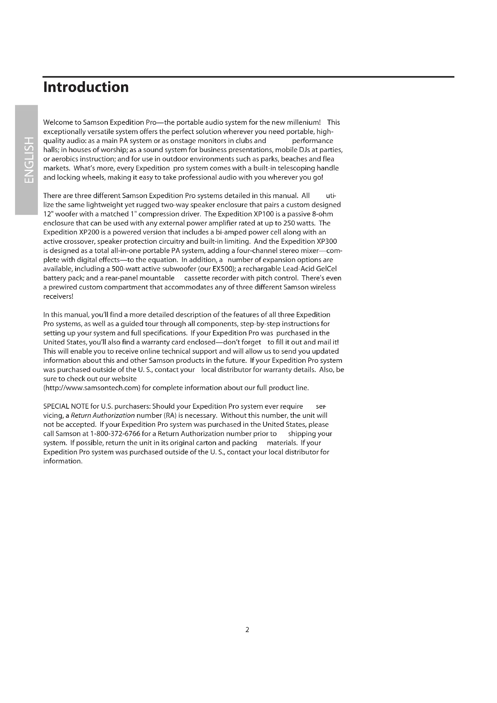 vicing, a Return Authorization number (RA) is necessary. Without this number, the unit will not be accepted. If your Expedition Pro system was purchased in the United States, please call Samson at 1-800-372-6766 for a Return Authorization number prior to shipping your system. If possible, return the unit in its original carton and packing materials. If your Expedition Pro system was purchased outside of the U. S., contact your local distributor for information. ENGLISH 2System Features The Samson Expedition Pro system uses state-of-the art technology to bring a revolutionary new degree of flex