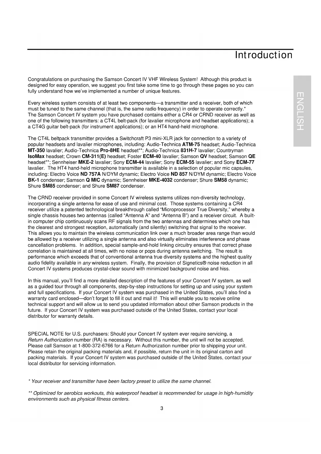 der CT4L/ CT4G Taschensender 23 das HT4 Handsendemikrofon 24 Inbetriebnahme der Anlage 25 Anhang A CT4L Pinbelegung 38 Technische Daten Inside Back Cover ESPANOL Introducción 29 Recorrido guiado - Receptor CR4 30 Recorrido guiado - Receptor CRND 31 Recorrido guiado - Transmisor CT4L/CT4G 32 Recorrido guiado - Transmisor HT4 33 Ajuste y utilización del sistema de la Concert IV 34 Apéndice A: Tabla y guía de cableado de conector multipuntas CT4L 38 Especificaciones Inside Back CoverIntroduction Congratulations on purchasing the Samson Concert IV VHF Wireless System! Although this product is designed for easy operation, we suggest you first take some time to go through these pages so you can fully understand how we’ve implemented a number of unique features. Every wireless system consists of at least two components—a transmitter and a receiver, both of which must be tuned to the same channel (that is, the same radio frequency) in order to operate correctly.* The Samson Concert IV system you have purchased contains either a CR4 or CRND receiver as well as one of the following transmitters: a CT4L belt-pack (for lavalier microphone and headset applications); a a CT4G guitar belt-pack (for instrument applications); or an HT4 hand-held microphone. The CT4L beltpack transmitter provides a Switchcraft P3 mini-XLR jack for connection to a variety of popular headsets and lavalier microphones, including: Audio-Technica ATM-75 headset; Audio-Technica MT-350 lavalier; Audio-Technica Pro-8HE headset**; Audio-Technica 831H-7 lavalier; Countryman IsoMax headset; Crown CM-311(E) headset; Foster ECM-40 lavalier; Samson QV headset; Samson QE headset**; Sennheiser MKE-2 lavalier; Sony ECM-44 lavalier; Sony ECM-55 lavalier; and Sony ECM-77 lavalier. The HT4 hand-held microphone transmitter is available in a selection of popular mic capsules, including: Electro Voice ND 757A N/DYM dynamic; Electro Voice ND 857 N/DYM dynamic; Electro Voice BK-1 condenser; Samson Q MIC dynamic; Sennheiser MKE-4032 condenser; Shure SM58 dynamic; Shure SM85 condenser; and Shure SM87 condenser. The CRND receiver provided in some Concert IV wireless systems utilizes non-diversity technology, incorporating a single antenna for ease of use and minimal cost. Those systems containing a CR4 receiver utilize a patented technological breakthrough called “Microprocessor True Diversity,” whereby a single chassis houses two antennas (called “Antenna A” and “Antenna B”) and a receiver circuit. A built- in computer chip continuously scans RF signals from the two antennas and determines which one has the clearest and strongest reception, automatically (and silently) switching that signal to the receiver. This allows you to maintain the wireless communication link over a much broader area range than would be allowed by a receiver utilizing a single antenna and also virtually eliminates interference and phase cancellation problems. In addition, special sample-and-hold linking circuitry ensures that correct phase correlation is maintained at all times, with no noise or pops during antenna switching. The result is performance which exceeds that of conventional antenna true diversity systems and the highest quality audio fidelity available in any wireless system. Finally, the provision of Signetics® noise reduction in all Concert IV systems produces crystal-clear sound with minimized background noise and hiss. In this manual, you’ll find a more detailed description of the features of your Concert IV system, as well as a guided tour through all components, step-by-step instructions for setting up and using your system and full specifications. If your Concert IV system was purchased in the United States, you’ll also find a warranty card enclosed—don’t forget to fill it out and mail it! This will enable you to receive online technical support and will allow us to send you updated information about other Samson products in the future. If your Concert IV system was purchased outside of the United States, contact your local distributor for warranty details. SPECIAL NOTE for U.S. purchasers: Should your Concert IV system ever require servicing, a Return Authorization number (RA) is necessary. Without this number, the unit will not be accepted. Please call Samson at 1-800-372-6766 for a Return Authorization number prior to shipping your unit. Please retain the original packing materials and, if possible, return the unit in its original carton and packing materials. If your Concert IV system was purchased outside of the United States, contact your local distributor for servicing information.