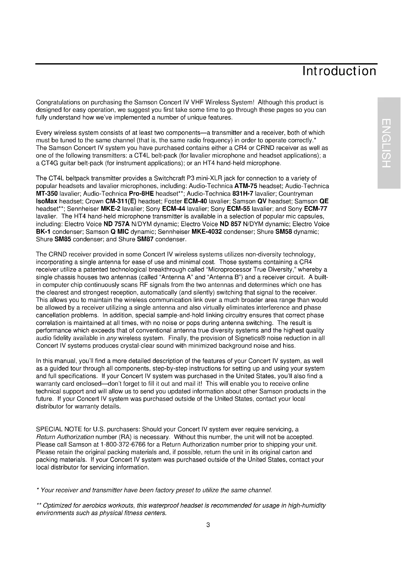 SPECIAL NOTE for U.S. purchasers: Should your Concert IV system ever require servicing, a Return Authorization number (RA) is necessary. Without this number, the unit will not be accepted. Please call Samson at 1-800-372-6766 for a Return Authorization number prior to shipping your unit. Please retain the original packing materials and, if possible, return the unit in its original carton and packing materials. If your Concert IV system was purchased outside of the United States, contact your local distributor for servicing information.
