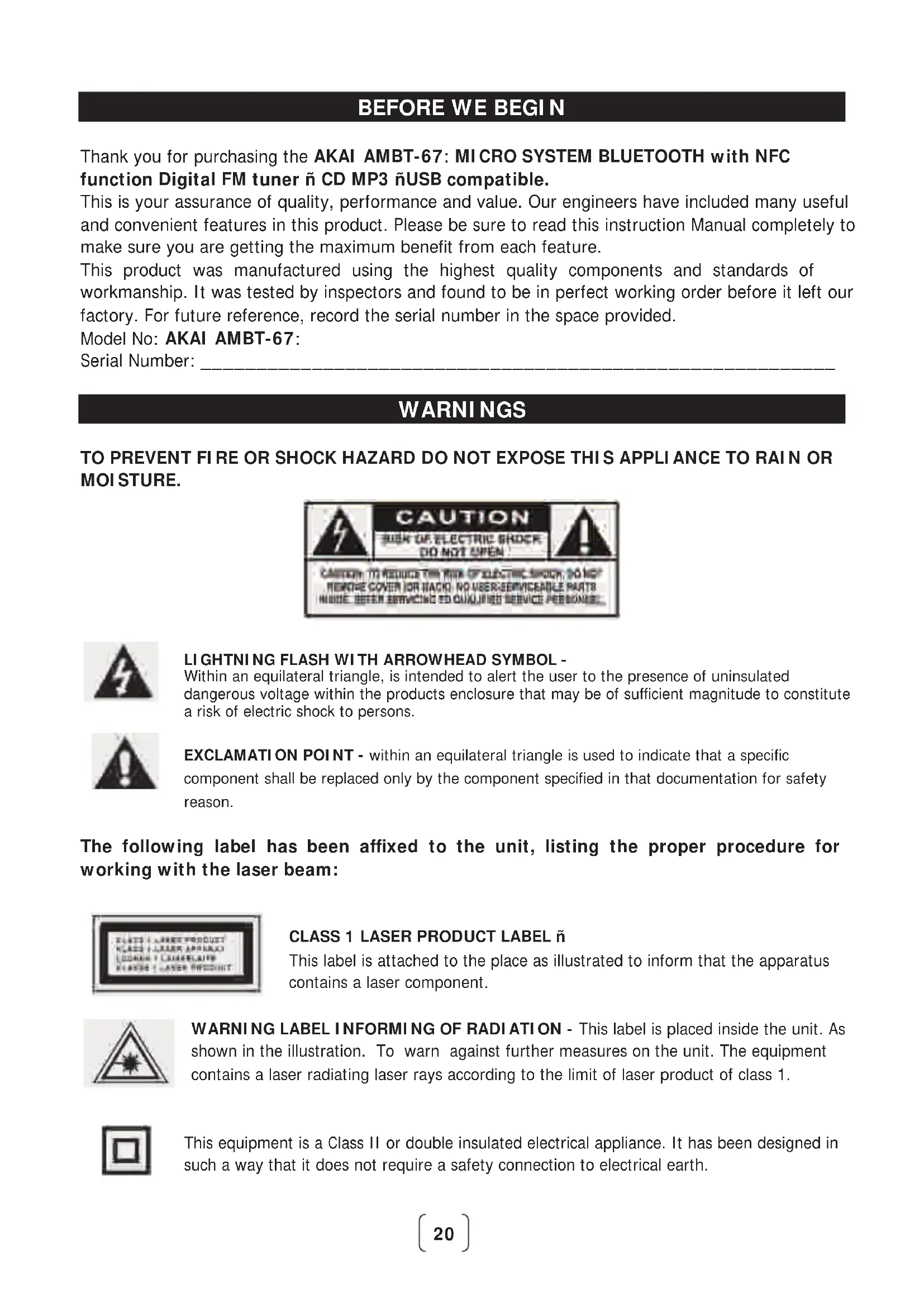 Thank you for purchasing the AKAI AMBT-67: MICRO SYSTEM BLUETOOTH with NFC function Digital FM tuner – CD MP3 –USB compatible. This is your assurance of quality, performance and value. Our engineers have included many useful and convenient features in this product. Please be sure to read this instruction Manual completely to make sure you are getting the maximum benefit from each feature. This product was manufactured using the highest quality components and standards of workmanship. It was tested by inspectors and found to be in perfect working order before it left our factory. For future reference, record the serial number in the space provided. Model No: AKAI AMBT-67: Serial Number: _________________________________________________________ WARNINGS TO PREVENT FIRE OR SHOCK HAZARD DO NOT EXPOSE THIS APPLIANCE TO RAIN OR MOISTURE.