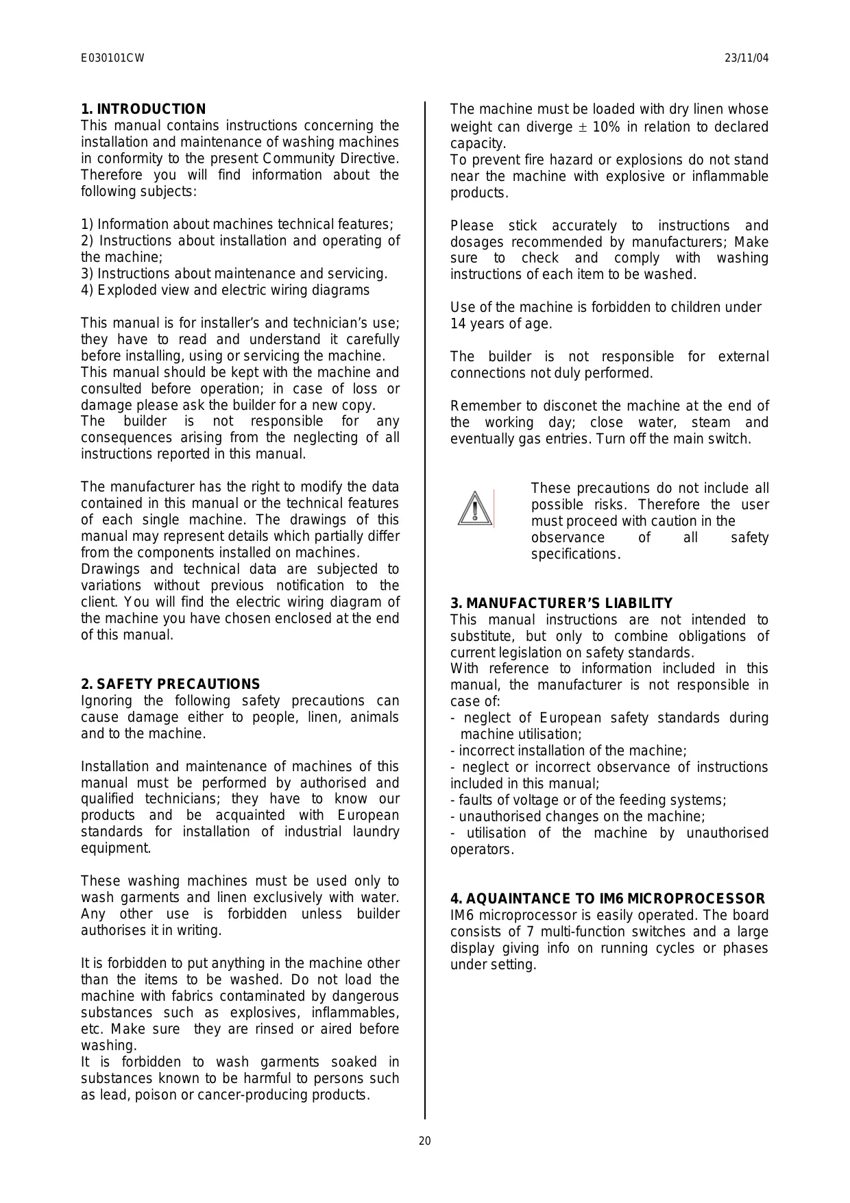 Ignoring the following safety precautions can cause damage either to people, linen, animals and to the machine. Installation and maintenance of machines of this manual must be performed by authorised and qualified technicians; they have to know our products and be acquainted with European standards for installation of industrial laundry equipment. These washing machines must be used only to wash garments and linen exclusively with water. Any other use is forbidden unless builder authorises it in writing.