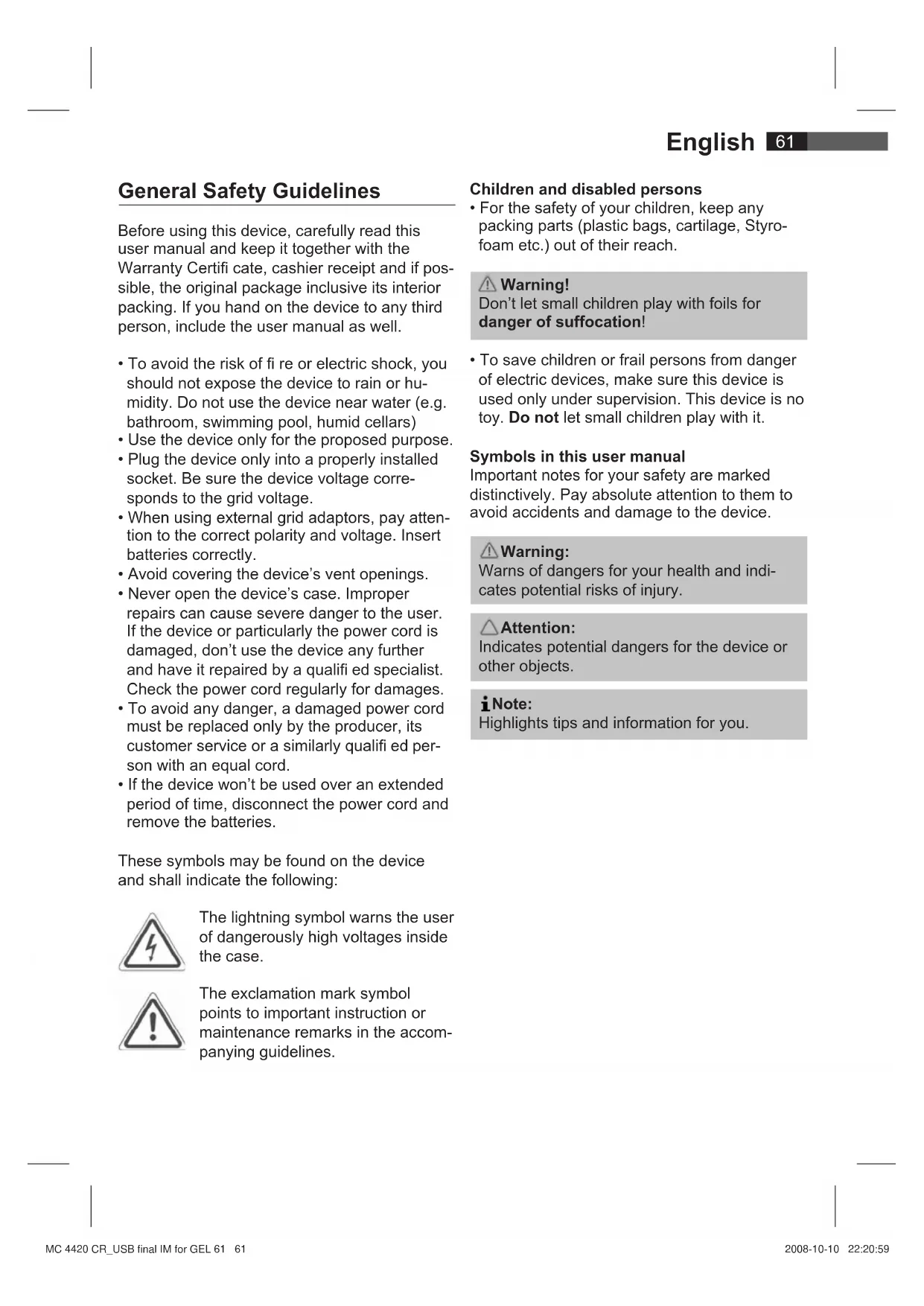 - Close the battery compartment. If the device is not used for an extended period of time, remove the batteries from the device to avoid any leaking of battery acid. Attention: Batteries don’t pertain to household waste. Please take empty batteries to a competent collection point or back to a dealer. English MC 4420 CR_USB final IM for GEL 62 62MC 4420 CR_USB final IM for GEL 62 62 2008-10-10 22:21:012008-10-10 22:21:0163