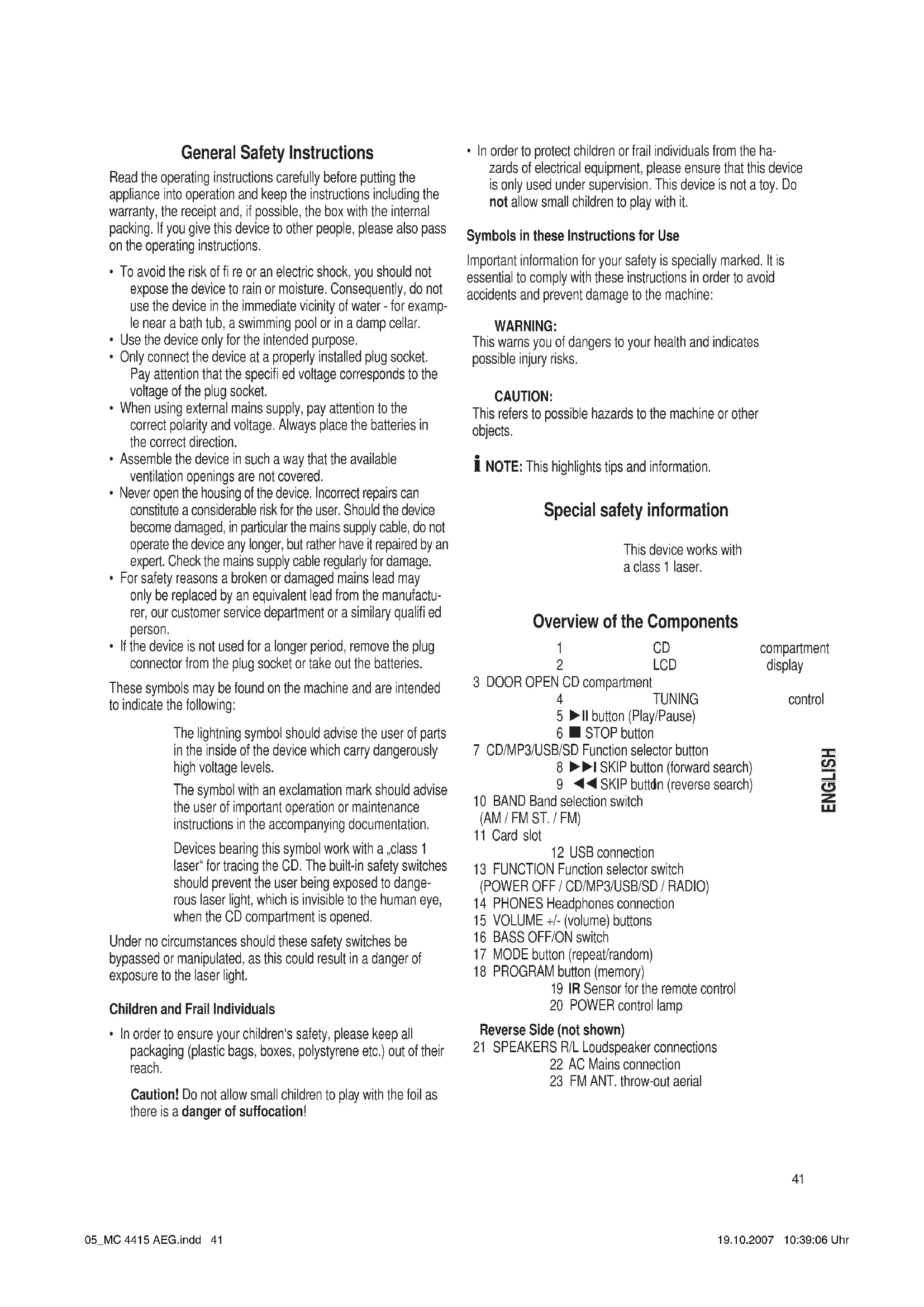 - Any marks on the surface can be wiped off with a slightly damp cloth without any additives. Troubleshooting Symptoms Course Solution CD can not be played back. CD is not inserted or inserted incor- rectly. Ensure that the disc is inserted with the label facing upwards. CD jumps during playback. Check the disc for fi ngerprints, dirt or scratches. Check the disc for fi ngerprints, dirt or scratches. Technical Data Model: ........................................................... MC 4415 CD/MP3 Power supply: ........................................................ 230 V, 50 Hz Output rating: ........................................................ 100 W PMPO Protection class: .......................................................................ΙΙ Net weight: ........................................................................ 2,8 kg Radio section: Frequency ranges: ..................UKW / FM 87,8 ~ 108,7 MHz .......................MW / AM 525 ~ 1638 kHz This device has been tested according to all relevant current CE guidelines, such as electromagnetic compatibility and low voltage directives, and has been constructed in accordance with the latest safety regulations. Subject to technical changes without prior notice! Guarantee The device supplied by our Company is covered by a 24 month guarantee starting on the date of purchase (receipt). During the life of the guarantee any fault of the device or its accessories ascribable to material or manufacturing defects will be eliminated free of charge by repairing or, at our discretion, by replacing it. The guarantee services do not entail an extension of the life of the guarantee nor do they give rise to any right to a new guarantee! Proof of the guarantee is provided by the proof of purchase. Without proof of purchase no free replacement or repair will be carried out. If you wish to make a claim under the guarantee please return the entire machine in the original packaging to your dealer together with the receipt. Defects to consumables or parts subject to wearing as well as cleaning, maintenance or the replacement of said parts are not covered by the guarantee and hence are to be paid! The guarantee lapses in case of unauthorized tampering. After the expiry of the guarantee After the expiry of the guarantee repairs can be carried by the competent dealer or repair service against the payment of the ensuing costs. Meaning of the “Dustbin” Symbol Protect our environment: do not dispose of electrical equipment in the domestic waste. Please return any electrical equipment that you will no longer use to the collection points provided for their disposal. This helps avoid the potential effects of incorrect disposal on the environment and human health. This will contribute to the recycling and other forms of reutilisati- on of electrical and electronic equipment. Information concerning where the equipment can be disposed of can be obtained from your local authority. 05_MC 4415 AEG.indd 4505_MC 4415 AEG.indd 45 19.10.2007 10:39:08 Uhr19.10.2007 10:39:08 Uhr46