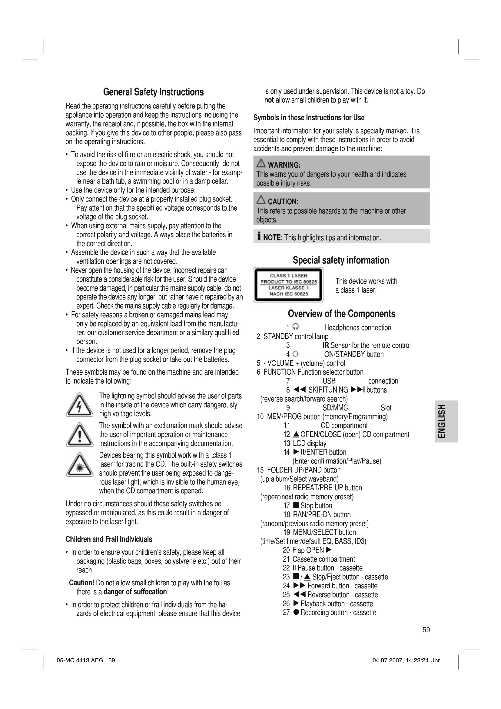 - Any marks on the surface can be wiped off with a slightly damp cloth without any additives. Technical Data Model: ........................................................... MC 4413 CD/MP3 Power supply: ........................................................ 230 V, 50 Hz Output rating:........................................................ 100 W PMPO Protection class: ...................................................................... ΙΙ Radio section: Frequency ranges: .............................FM 87,5 ~ 108,0 MHz ................................ AM 522 ~ 1620 kHz This device has been tested according to all relevant current CE guidelines, such as electromagnetic compatibility and low voltage directives, and has been constructed in accordance with the latest safety regulations. Subject to technical changes without prior notice! Guarantee The device supplied by our Company is covered by a 24 month guarantee starting on the date of purchase (receipt). During the life of the guarantee any fault of the device or its accessories ascribable to material or manufacturing defects will be eliminated free of charge by repairing or, at our discretion, by replacing it. The guarantee services do not entail an extension of the life of the guarantee nor do they give rise to any right to a new guarantee! Proof of the guarantee is provided by the proof of purchase. Without proof of purchase no free replacement or repair will be carried out. If you wish to make a claim under the guarantee please return the entire machine in the original packaging to your dealer together with the receipt. Defects to consumables or parts subject to wearing as well as cleaning, maintenance or the replacement of said parts are not covered by the guarantee and hence are to be paid! The guarantee lapses in case of unauthorized tampering. After the expiry of the guarantee After the expiry of the guarantee repairs can be carried by the competent dealer or repair service against the payment of the ensuing costs. 05-MC 4413 AEG 65 04.07.2007, 14:23:34 UhrENGLISH ENGLISH