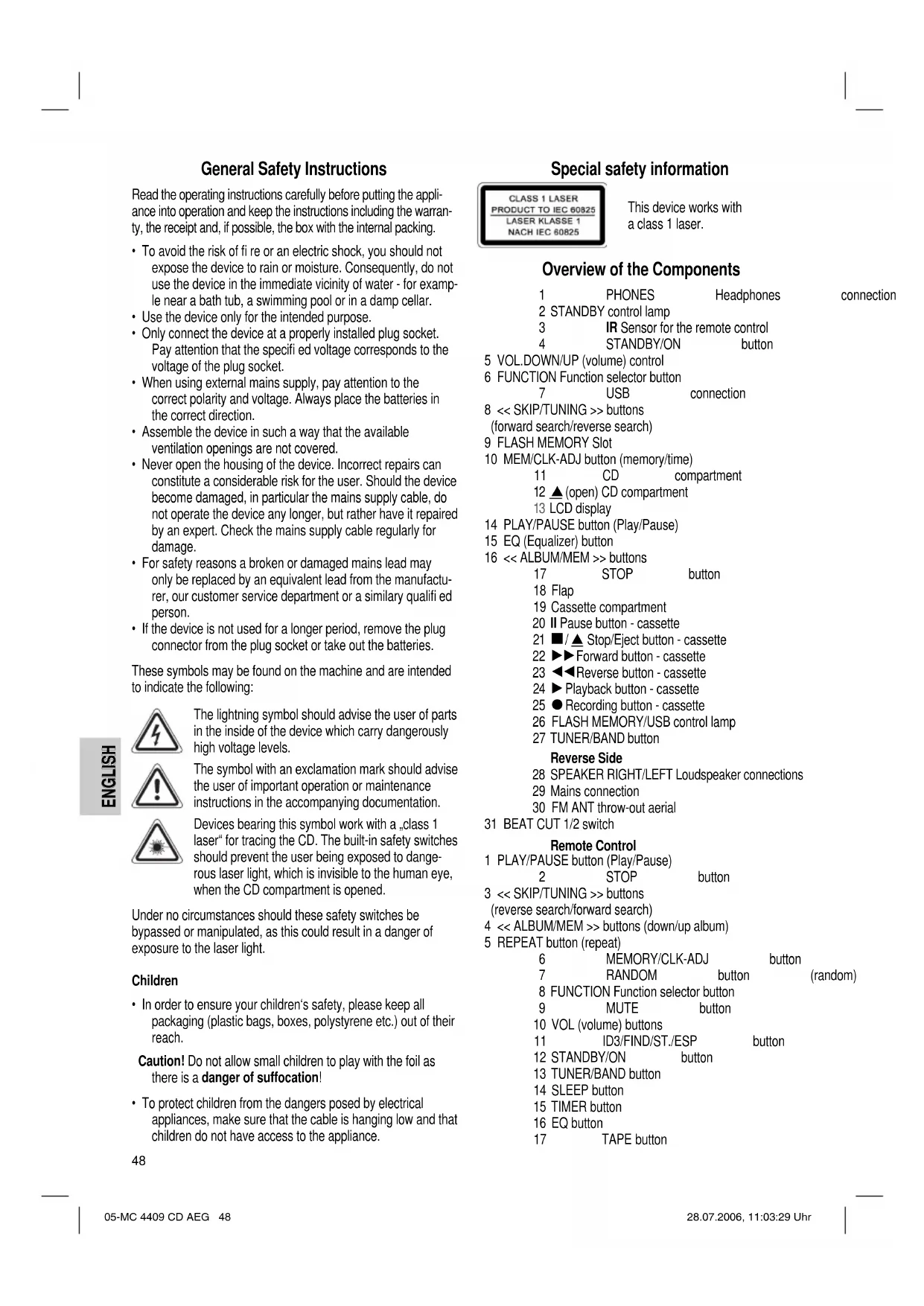 - Playback of CDs produced by the user cannot be guaran- teed due to the large variety of software and CD media available. 05-MC 4409 CD AEG 50 28.07.2006, 11:03:34 UhrENGLISH ENGLISH ENGLISH