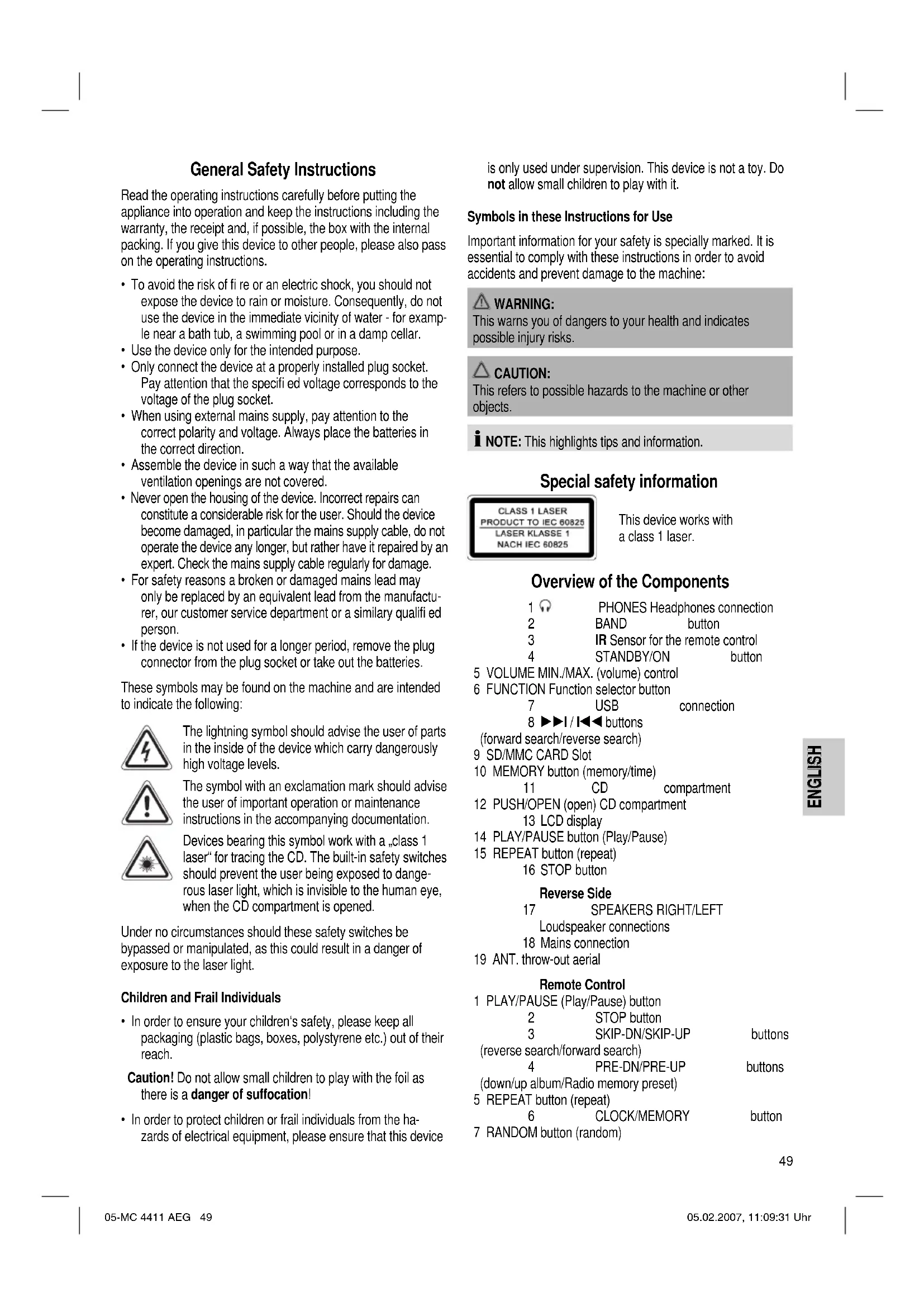 Do not expose the batteries to high temperatures or direct sunlight. Never throw batteries into the fi re. There is a danger of explosion! CD deck transport protection Please open the CD compartment (11) by pressing the PUSH/ OPEN (open) button (12). Remove the transport protection from the CD player if present before use. General Operation NOTE: Some keys are to be found both on the device itself and on the remote control. Keys with the same designation have the same function. STANDBY/ON / POWER (4/12) Switch the device to the standby mode with the STANDBY/ON / POWER button (the time is displayed). If this button is pressed once more, the device switches on again. Volume (5/10) This is used to set the individual volume. The letters „VOL“ and a fi gure appear in the display (13). This corresponds to the volume that has been set as far as „VOL 30“ or „VOL 00“. PHONES Headphone Socket (1) Please use headphones with a 3.5 mm stereo jack plug; these should be inserted into the headphone socket. The loudspea- kers are then switched off. DBBS (19 on the remote control) To increase or decrease the bass output. BBS ON = on, BBS OFF = off. INTRO (20 on the remote control) Press the INTRO button (INTRO appears in the display). Each track on the CD is played for 10 seconds. Press this button again to stop searching. The currently selected track is played. Infrared remote control For operating the music centre from a distance of up to 5 metres without a lead. If the range of the remote control is reduced, the batteries have to be replaced. During operation ensure that there is nothing blocking the direct line between the remote control and the sensor (3) on the machine. USB Connexion (7) This device has been developed in accordance with the latest technical developments in the USB fi eld. Unfortunately the large number of different types of USB storage media on offer today 05-MC 4411 AEG 50 05.02.2007, 11:09:34 UhrENGLISH ENGLISH ENGLISH