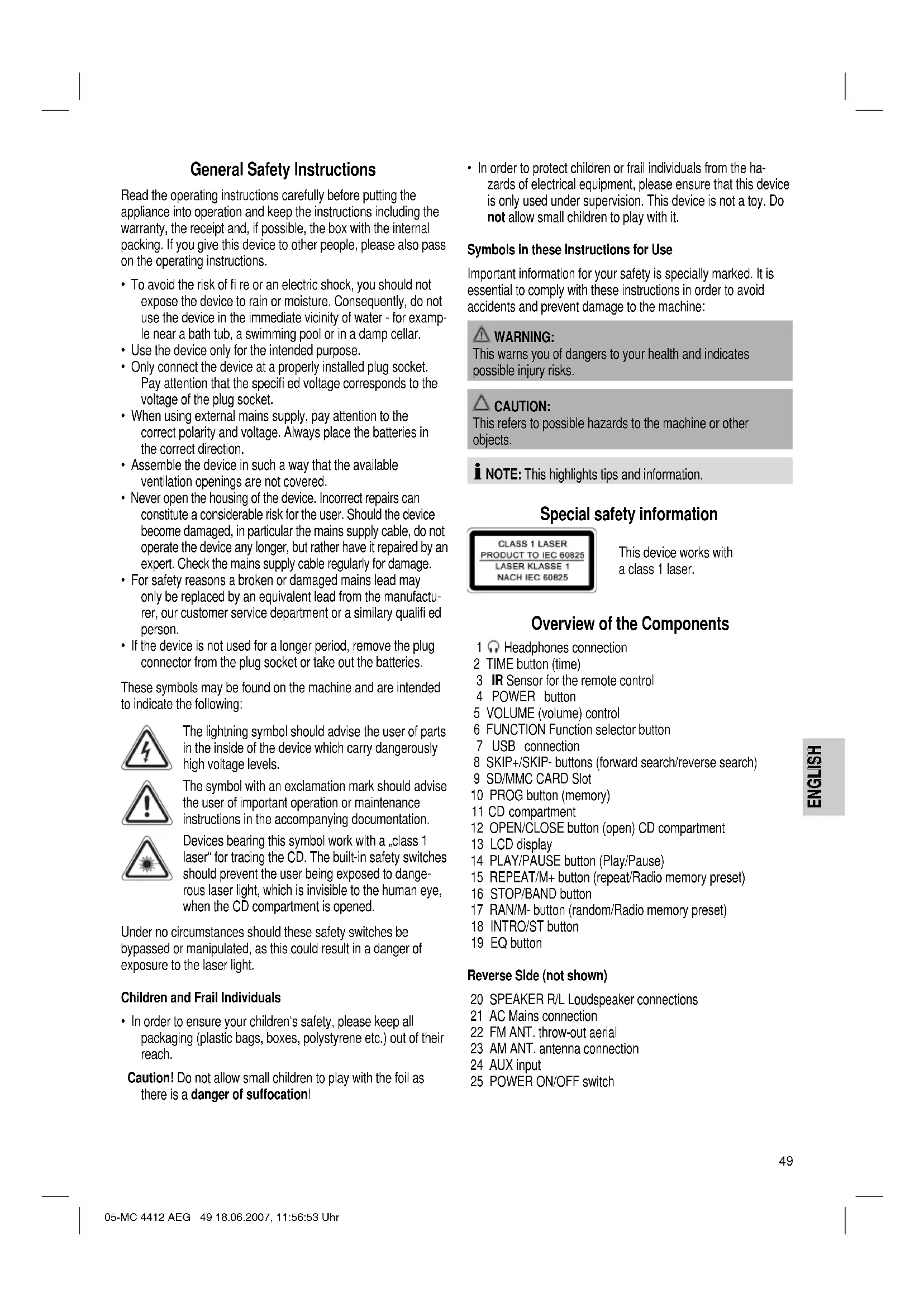 This warns you of dangers to your health and indicates possible injury risks. CAUTION: This refers to possible hazards to the machine or other objects. NOTE: This highlights tips and information. Special safety information This device works with a class 1 laser. Overview of the Components 1 Headphones connection 2 TIME button (time) 3 IR Sensor for the remote control 4 POWER button 5 VOLUME (volume) control 6 FUNCTION Function selector button 7 USB connection 8 SKIP+/SKIP- buttons (forward search/reverse search) 9 SD/MMC CARD Slot 10 PROG button (memory) 11 CD compartment 12 OPEN/CLOSE button (open) CD compartment 13 LCD display 14 PLAY/PAUSE button (Play/Pause) 15 REPEAT/M+ button (repeat/Radio memory preset) 16 STOP/BAND button 17 RAN/M- button (random/Radio memory preset) 18 INTRO/ST button 19 EQ button Reverse Side (not shown) 20 SPEAKER R/L Loudspeaker connections 21 AC Mains connection 22 FM ANT. throw-out aerial 23 AM ANT. antenna connection 24 AUX input 25 POWER ON/OFF switch 05-MC 4412 AEG 49 18.06.2007, 11:56:53 UhrENGLISH ENGLISH