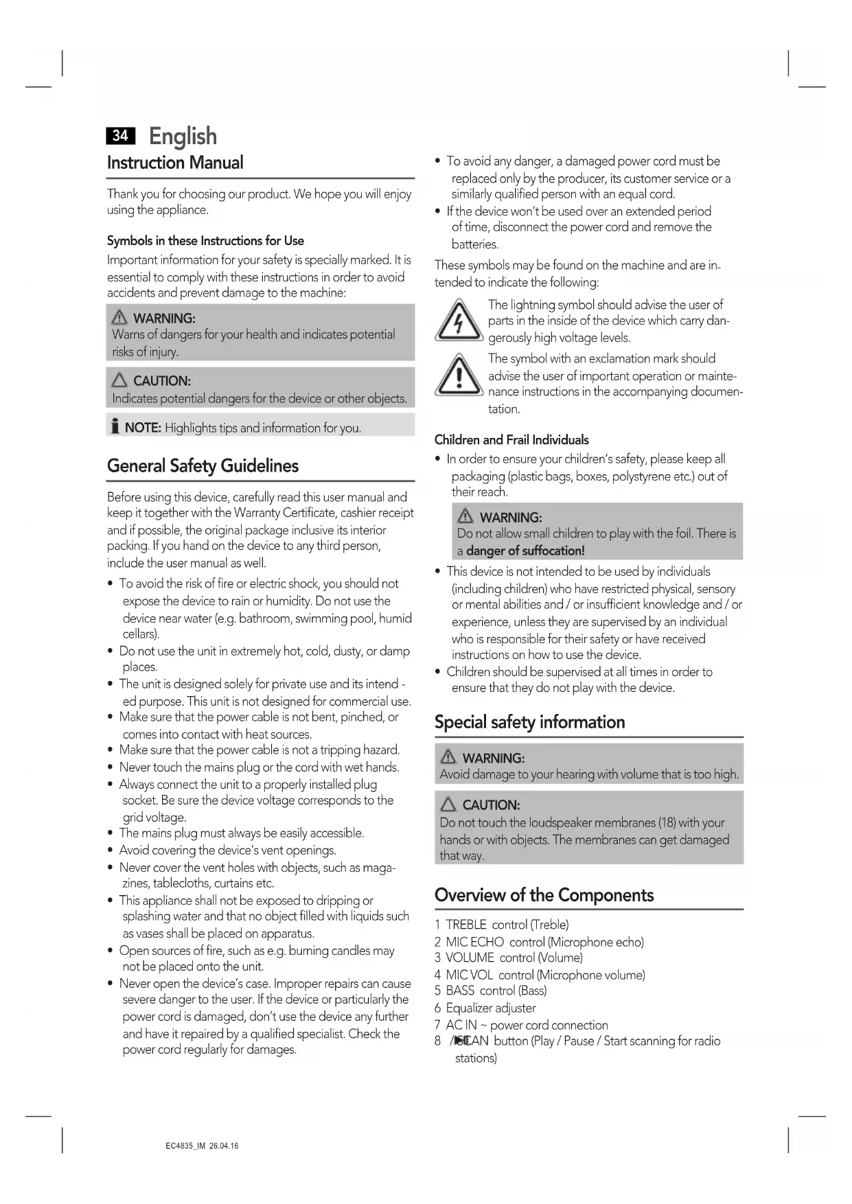 er’s reverberation distance. Technical Data Model: ...................................................................................EC 4835 Power supply: .......................................... AC 100 − 240 V, 50 / 60 Hz Power consumption:................................................................. 42 W Protection class: ................................................................................ Net weight: .............................................................. approx. 8.15 kg Radio section Frequency ranges: ..................................FM 87.5 ~ 108.0 MHz Bluetooth Bluetooth support: .......................................................... V 2.1+EDR Range: ..................................................................approx. 15 metres Transmission frequency: ......................................2.402-2.480 GHz Protocols: ...................................................................A2DP / AVRCP The right to make technical and design modifications in the course of continuous product development remains reserved. This device complies with all current CE directives, such as electromagnetic compatibility and low voltage directive and is manufactured according to the latest safety regulations. Disposal Meaning of the “Wheelie Bin” Symbol Take care of our environment, do not dispose of electrical appliances via the household waste. Dispose of obsolete or defective electrical appliances via municipal collection points. Please help to avoid potential environmental and health impacts through improper waste disposal. You contribute to recycling and other forms of utilization of old electric and electronic appliances. Your municipality provides you with information about col