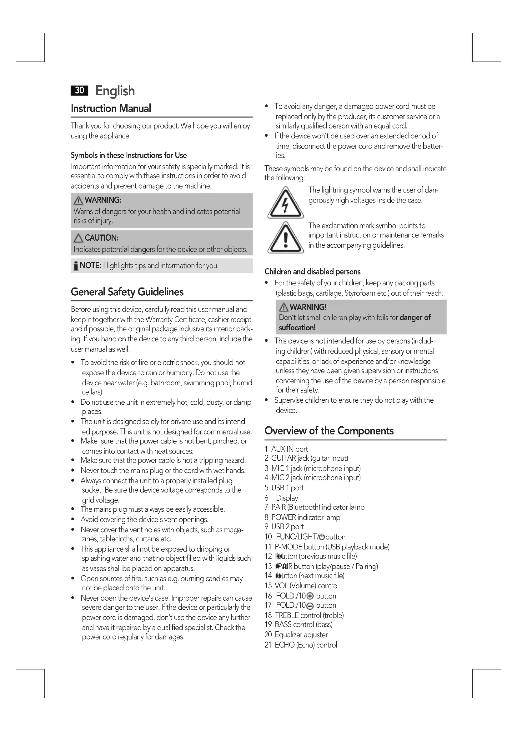 - For the safety of your children, keep any packing parts (plastic bags, cartilage, Styrofoam etc.) out of their reach.