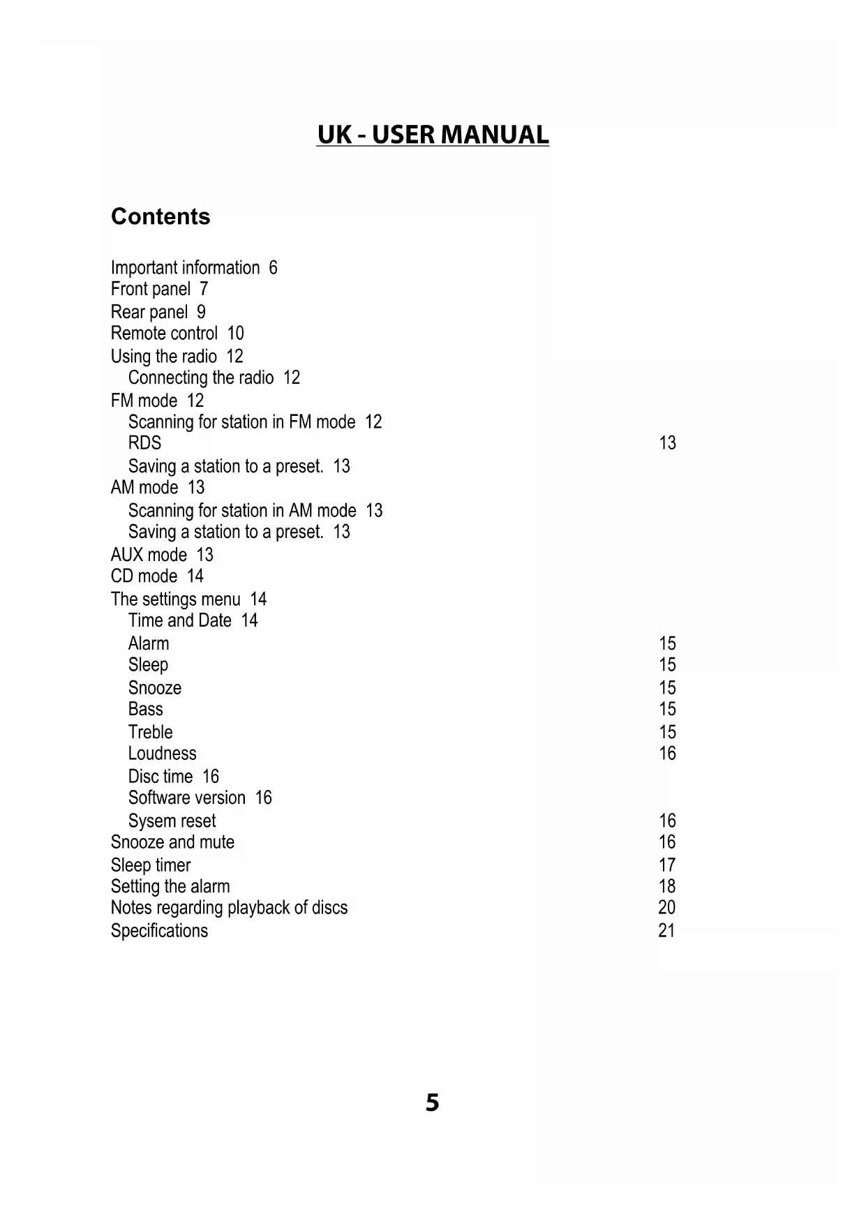 Contents Important information 6 Front panel 7 Rear panel 9 Remote control 10 Using the radio 12 Connecting the radio 12 FM mode 12 Scanning for station in FM mode 12 RDS 13 Saving a station to a preset. 13 AM mode 13 Scanning for station in AM mode 13 Saving a station to a preset. 13 AUX mode 13 CD mode 14 The settings menu 14 Time and Date 14 Alarm 15 Sleep 15 Snooze 15 Bass 15 Treble 15 Loudness 16 Disc time 16 Software version 16 Sysem reset 16 Snooze and mute 16 Sleep timer 17 Setting the alarm 18 Notes regarding playback of discs 20 Specifications 216 Important information Congratulations on your new radio. Please read this manual carefully to avoid malfunction and damage to the clock radio and to ensure that the radio will be a source of great pleasure to you for a very long time.