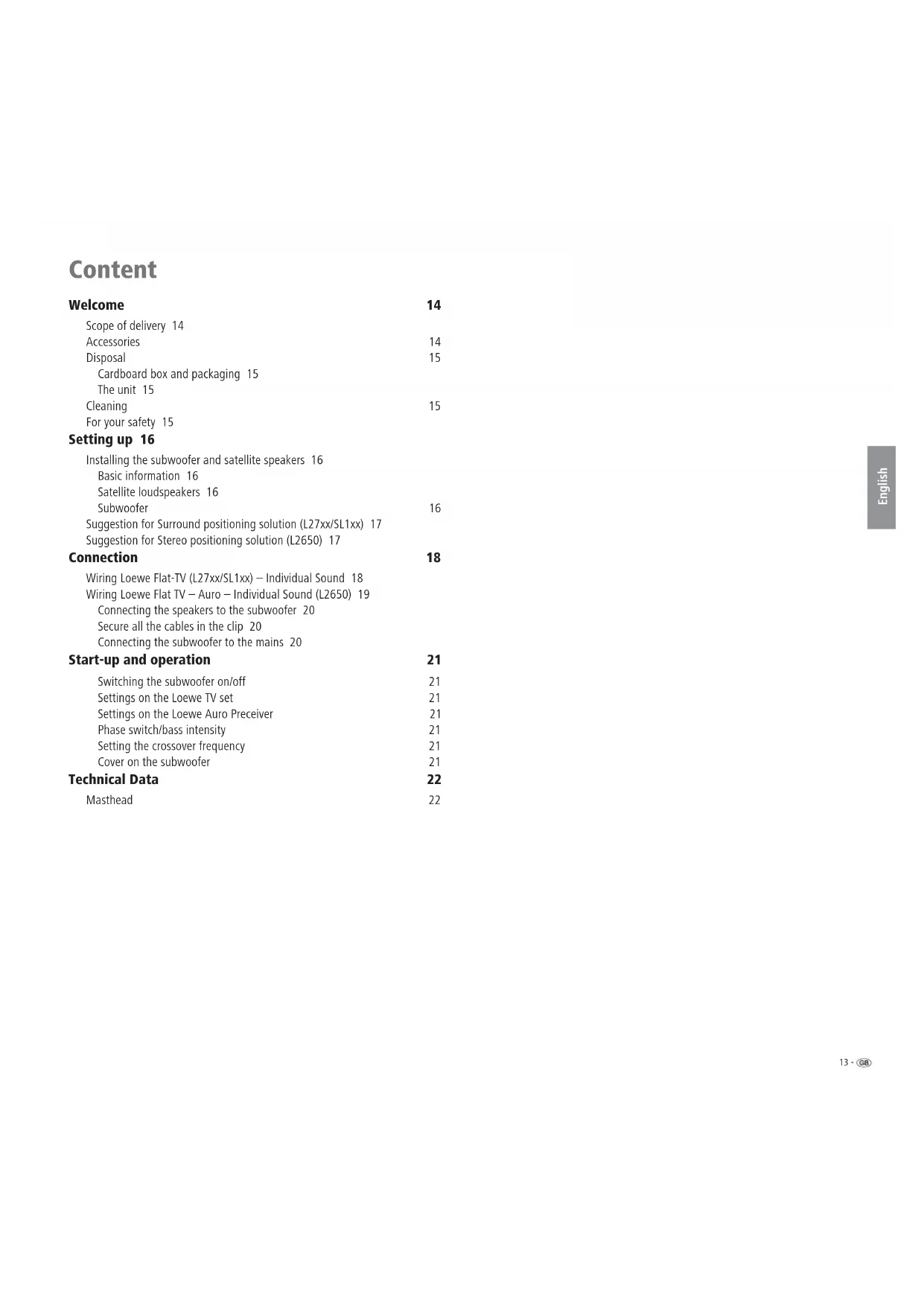 Front left Front right Surround left Surround right Subwoofer Satellite speakers Standing speaker21 - English Start-up and operation Before beginning with start-up and operation, make sure that all the cables are connected correctly. Switching the subwoofer on/off You switch the Individual Sound loudspeaker system on in position “I – ON” with the ON/OFF switch g. If the subwoofer is connected as described on page 18 to 19, there is no need to switch the subwoofer on and off separately any more. After switching on the subwoofer for the rst time, it is always switched on and off immediately with the Loewe TV set or the Loewe Auro Preceiver. Settings on the Loewe TV set Make the necessary settings on your Loewe Auro Preceiver as described in the Auro operating manual in the chapter “Initial start-up” / “External devices“. Settings on the Loewe Auro Preceiver Make the necessary settings on your Loewe Auro Preceiver as described in the Auro operating manual in the chapter “Initial start-up – setting the loudspeaker system”. Phase switch/bass intensity The “Phase” switch i and the “Bass intensity” knob h enable you to optimize bass reproduction. We recommend you to proceed as follows: