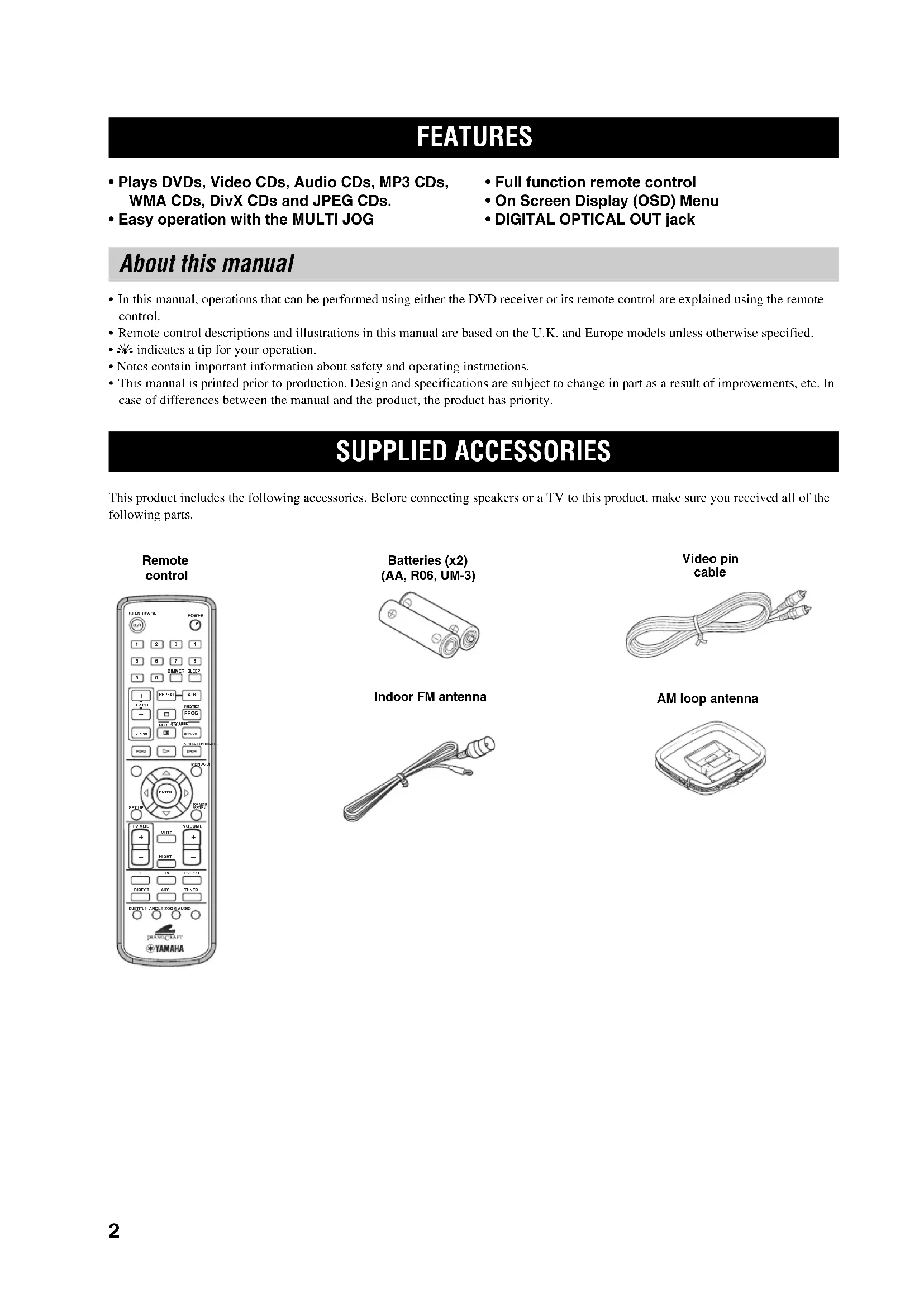 - This manual is printed prior to production. Design and specifications are subject to change in part as a result of improvements, etc. In case of differences between the manual and the product, the product has priority. This product includes the following accessories. Before connecting speakers or a TV to this product, make sure you received all of the following parts. FEATURES About this manual SUPPLIED ACCESSORIES POWER STANDBY/ON