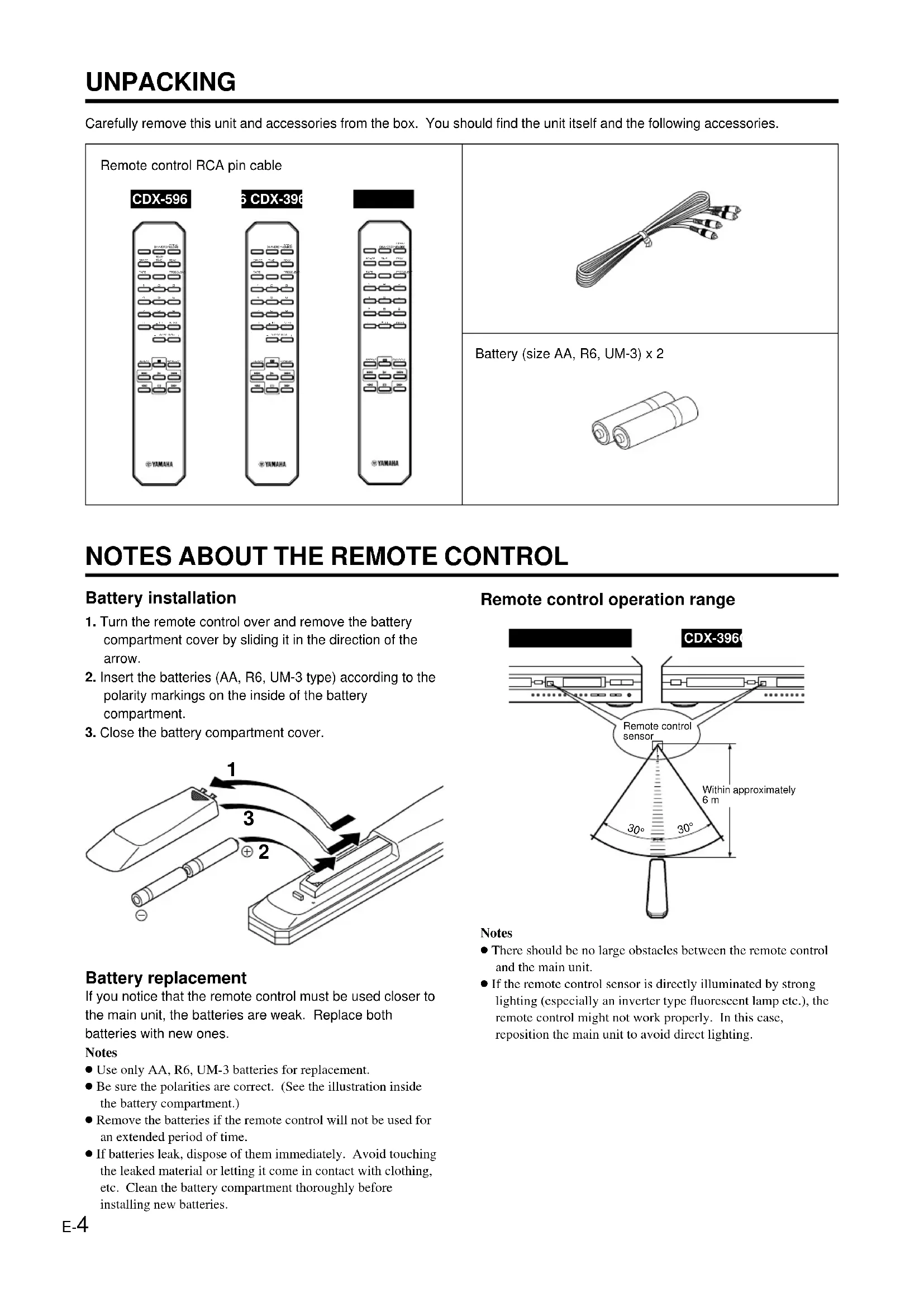 orE-22 TROUBLESHOOTING If the unit fails to operate normally, check the following points to determine whether the fault can be corrected by the simple measures suggested. If it cannot be corrected, or if the fault is not listed in the SYMPTOM column, disconnect the power cord and contact your authorized YAMAHA dealer or service center for help. SYMPTOM The unit does not switch ON when POWER is pressed. The disc tray does not close completely. Play does not begin. Play is delayed, or begins at the wrong place. No sound. Sound “skips”. Sound “hums”. Noise from a nearby tuner. Noise from inside of the disc tray. No sound from the headphones. (CDX-596 and CDX-496 only) The remote control does not work. TV functions strangely when the remote control is used. PROBABLE CAUSE The power cord is not connected nor completely connected. A foreign object is obstructing the tray. The disc is damaged. There is moisture on the laser pickup. The disc is loaded upside down. The disc is dirty. The CD-RW (ReWritable) disc is not recorded correctly. The disc is a non-standard disc not playable with this unit. The disc may be scratched or damaged. Improper output cable connections. Improper amplifier operation. The