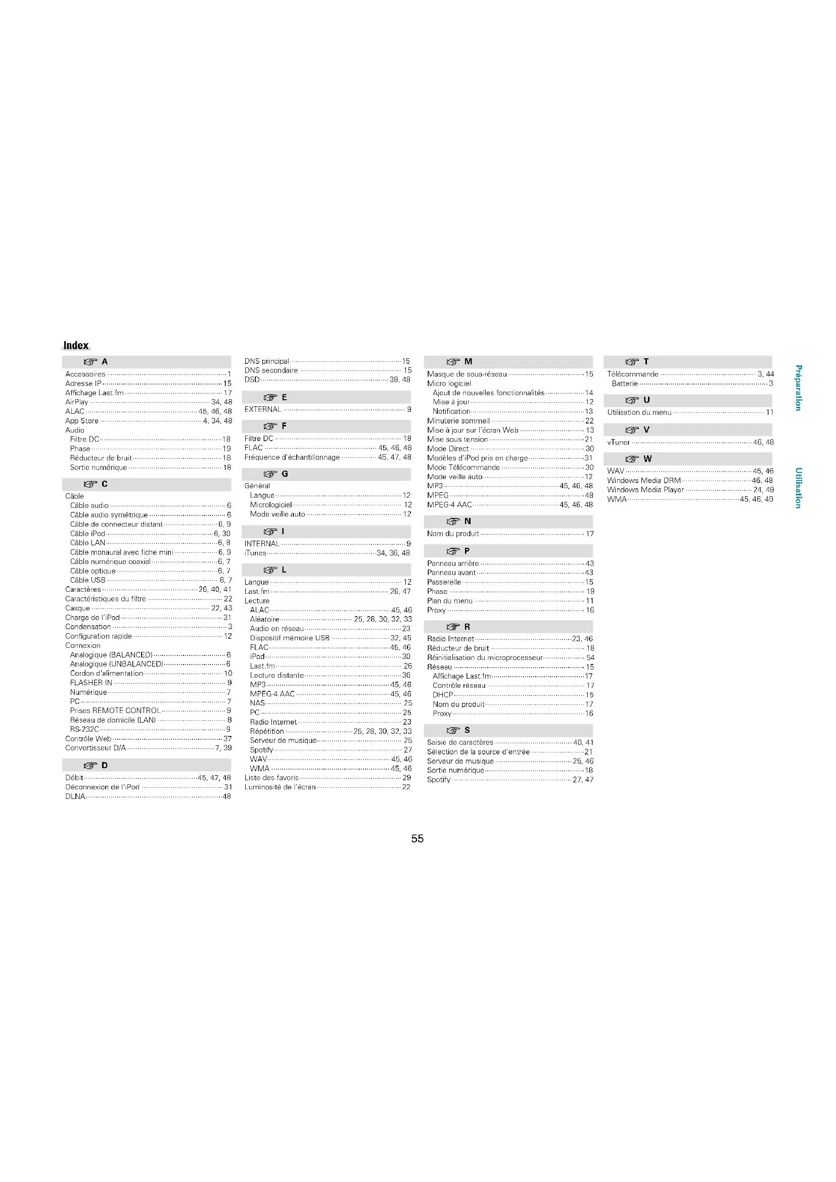 Lorsque le témoin STANDBY s’allume, relâchez les touches. “Initialized” s’ache. Si “Initialized” ne clignote pas à l’étape 3, reprenez à l’étape 1. Préparation Utilisation InformationsInformations55 v A Accessoires ·························································· 1 Adresse IP ·························································· 15 Achage Last.fm ··············································· 17 AirPlay ·························································· 34, 48 ALAC ······················································ 45, 46, 48 App Store ················································· 4, 34, 48 Audio Filtre DC ··························································· 18 Phase ······························································· 19 Réducteur de bruit ··········································· 18 Sortie numérique ············································· 18 v C Câble Câble audio ························································ 6 Câble audio symétrique ····································· 6 Câble de connecteur distant ·························· 6, 9 Câble iPod ···················································· 6, 30 Câble LAN ······················································ 6, 8 Câble monaural avec fiche mini ····················· 6, 9 Câble numérique coaxial ································ 6, 7 Câble optique ················································· 6, 7 Câble USB······················································ 6, 7 Caractères ·············································· 26, 40, 41 Caractéristiques du filtre ···································· 22 Casque ························································· 22, 43 Charge de l’iPod ················································· 31 Condensation ······················································· 3 Configuration rapide ··········································· 12 Connexion Analogique (BALANCED) ··································· 6 Analogique (UNBALANCED) ······························ 6 Cordon d'alimentation······································ 10 FLASHER IN ······················································ 9 Numérique ························································· 7 PC ······································································ 7 Prises REMOTE CONTROL ······························· 9 Réseau de domicile (LAN) ································· 8 RS-232C ····························································· 9 Contrôle Web ····················································· 37 Convertisseur D/A ·········································· 7, 39 v D Débit ······················································· 45, 47, 48 Déconnexion de l’iPod ······································· 31 DLNA ·································································· 48 DNS principal ······················································ 15 DNS secondaire ················································· 15 DSD ······························································ 39, 48 v E EXTERNAL ··························································· 9 v F Filtre DC ····························································· 18 FLAC ······················································ 45, 46, 48 Fréquence d’échantillonnage ················· 45, 47, 48 v G Général Langue ····························································· 12 Micrologiciel····················································· 12 Mode veille auto ································